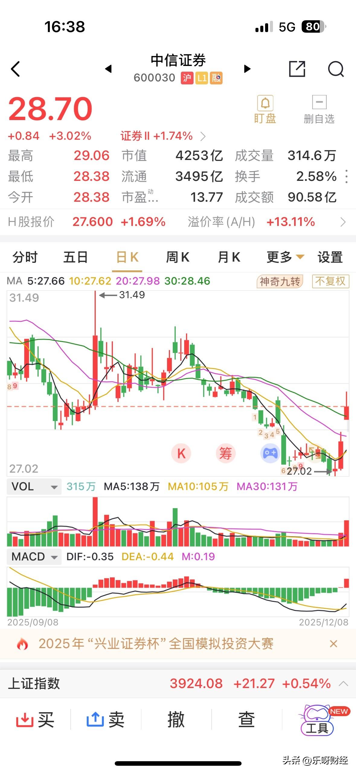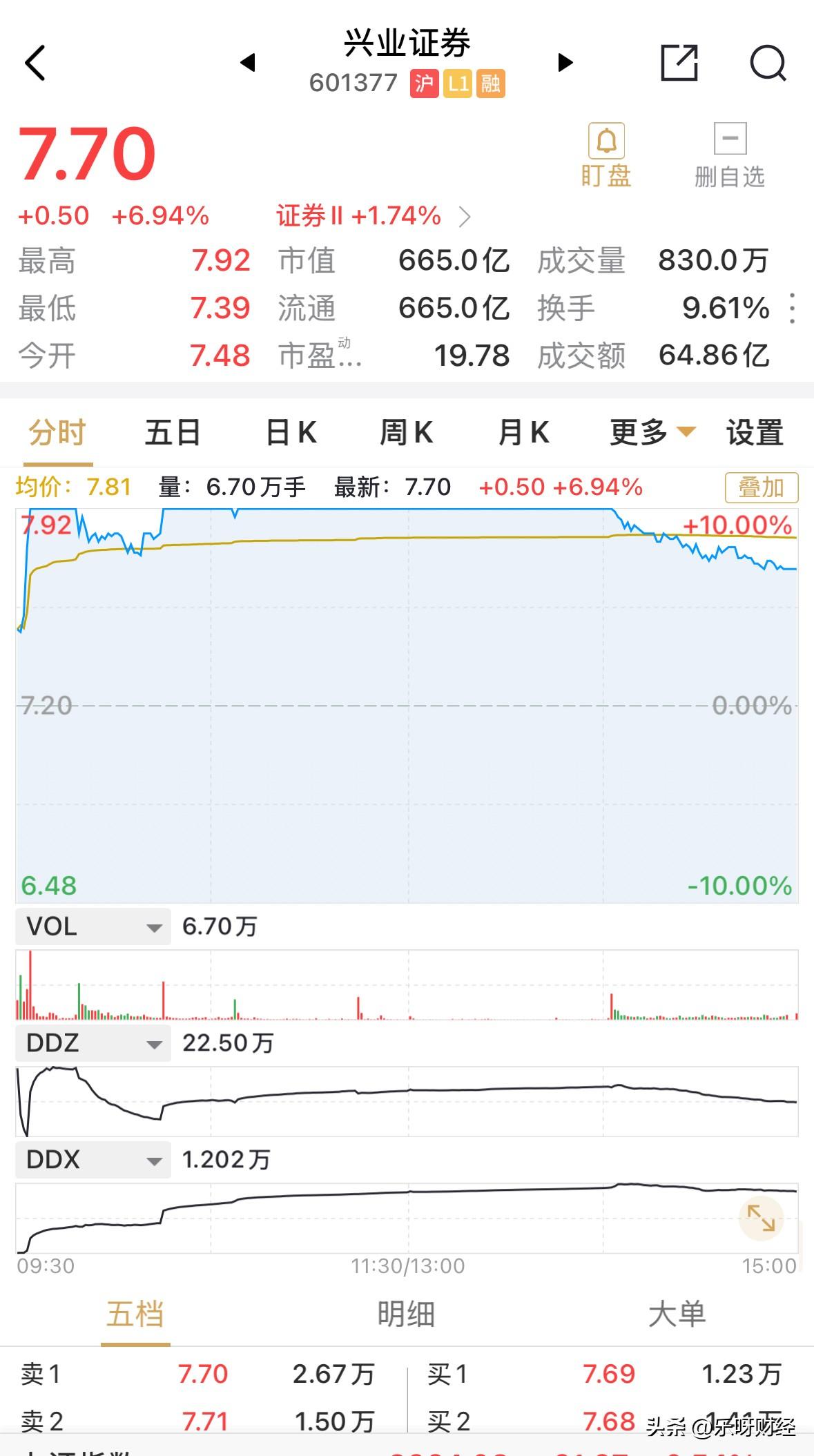 兴业证券午后两点打开了涨停板对券商板块的走势影响最大,虽然券商板块最终仍然收红,但留下了较长的上影线。 兴业证券因属福建板块,近两个交易日表现强劲,但日K线图均留下长长的上影线,而且周一的成交金额高达64.86亿元,放量未能封住涨停,料将陷入整理中。 估计券商板块若想延续向上回升,则必须要启动人气股东方财富或券商龙头中信证券。 而东方财富本交易日仅收涨1.42%,高开低走,日线收阴线,表现弱势。 中信证券收涨3.02%,表现较强,有望担起重任。 个人持股观察,勿作操作建议!