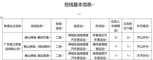 据介绍,此前,广东商之旅客运有限公司提出新增佛山禅城-肇庆怀集、佛山禅城-清远佛冈、佛山禅城-清远英德三条道路客运班线。对此,经过审核,佛山交通运输部门结合目的地交通运输主管部门意见,拟对佛山禅城-肇庆怀集、佛山禅城-清远佛冈道路客运班线予以许可,对佛山禅城-清远英德道路客运班线不予许可。