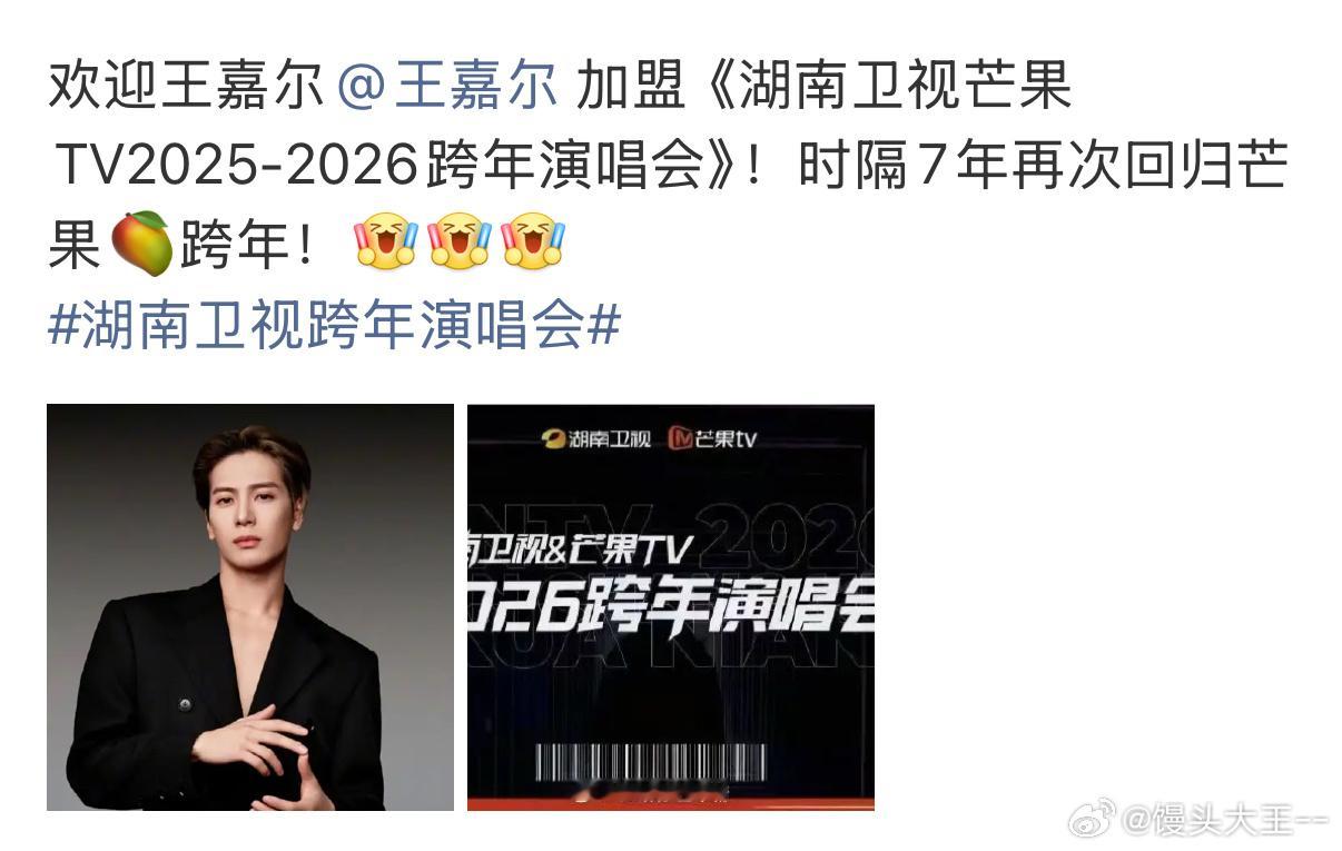 王嘉尔加盟湖南卫视芒果TV跨年演唱会 芒果跨年这波太会了!王嘉尔的电影级舞台+极致唱跳从来不让人失望,时隔7年的回归必须锁死直播,坐等和他一起迎接2026!