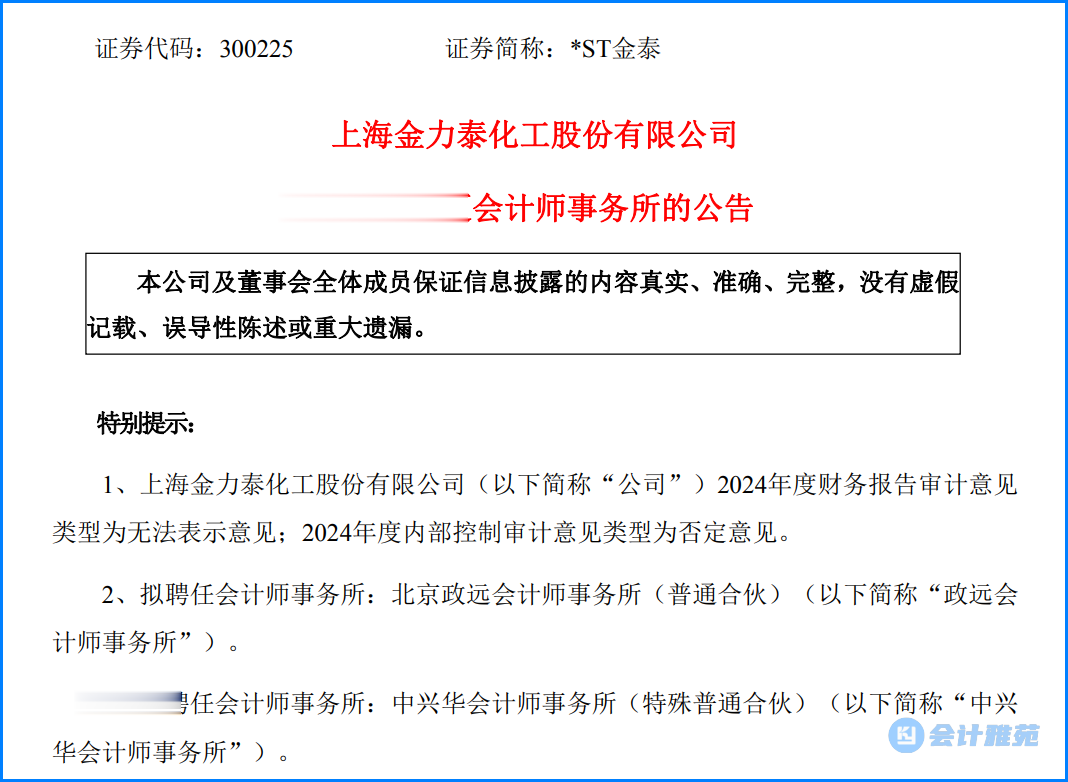 2025年4月23日,金力泰时任董事长、总裁罗甸,时任董事、执行总裁、董事会秘书吴纯超,时任财务总监隋静媛三人商量后决定,不接受年审机构中兴华会计师事务所(特殊普通合伙)拟对公司2024年度财务报表出具的“无法表示意见”审计报告,预计公司无法在法定期限内完成2024年年报的编制及披露工作。当天晚上,金力泰披露《关于公司预计无法在法定期限内披露定期报告暨公司股票可能被实施退市风险警示的风险提示公告》。