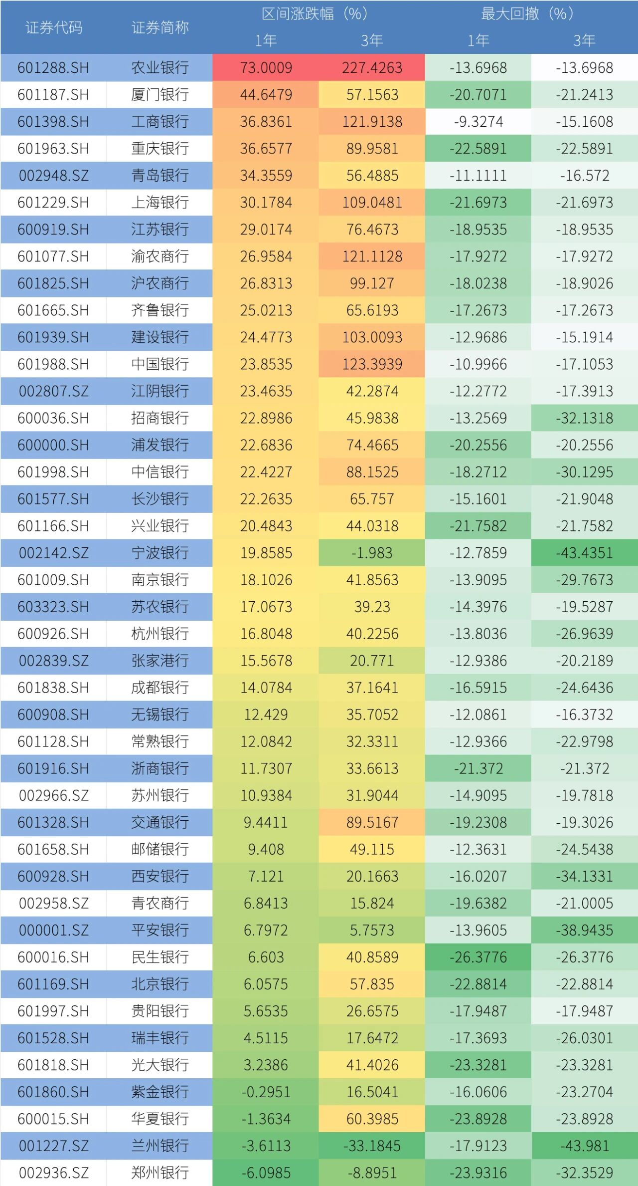 再从风险的角度看,过去1年中,41只银行股的最大回撤超过了-10%,只有工商银行的最大回撤不到-10%,但也有-9.33%。平均最大回撤为-16.97%。中位数最大回撤为-16.62%。如果把时间拉长到3年,平均最大回撤为-23.4%,中位数最大回撤为-21.73%,回撤最小的是农业银行为-13.7%。