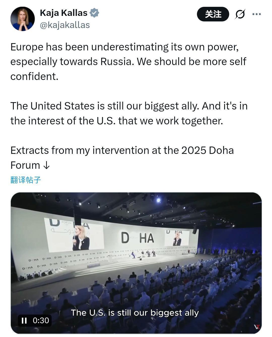 卡娅·卡拉斯又一令人难以置信的精彩瞬间 多哈论坛的灯光下,主持人身体前倾,指尖轻叩桌面,将问题抛向对面的欧盟外交与安全政策高级代表——卡娅·卡拉斯。这场本该聚焦国际合作的对话,因一份文件突然绷紧了空气:《美国国家安全报告》,这个近期在欧美外交圈掀起波澜的名字,此刻成了拷问欧洲定位的试金石。作为27国共同利益的发言人,卡拉斯的回答将直接关系到外界对欧盟外交独立性的判断。 当主持人的问题像手术刀般剖开表象——“所以,欧洲是敌人?你们是敌人咯?”——全场的目光都凝固在卡拉斯微微收紧的指节上。她深吸一口气,声音却比现场空调的冷风更让人意外。 “我没有读出那样的意思。”她避开主持人紧盯的视线,转向台下的镜头,“我的理解是,美国依然是我们最大的盟友,我们在一起符合美国利益。”这句话像一颗投入平静湖面的石子,只是激起的不是涟漪,而是更深的困惑。 更让人错愕的是,这场被外界视为“回避核心”的对话,竟被卡拉斯主动剪辑成片段,配上“跨大西洋伙伴关系的坚定声音”的文字,出现在她的社交账号主页。点赞数在滚动,评论区却开始出现欧盟外交官匿名的质疑:“她到底在替谁说话?是华盛顿的决策者,还是布鲁塞尔的民众?” 有人或许会说,这是外交场合的“话术技巧”,避免直接对抗才能为欧盟争取缓冲空间。但翻开那份被反复提及的美国报告,白纸黑字写着对欧洲的定位——“文明正在消亡”的地区,还附带一个明确的时间表:2027年前,欧洲需接手北约大部分常规防务。这哪里是“伙伴关系”的信号,分明是战略抽身的预告。 美国这份报告的出台,本质是其全球战略重心转移的必然结果——当亚太成为新的博弈焦点,欧洲在安全架构中的“前沿”地位正在松动。推断到实际影响,便是欧盟若继续沉浸在“最大盟友”的幻觉里,防务自主化进程将再次停滞,那些喊了多年的“战略自主”口号,只会沦为空谈。 短期来看,卡拉斯的回应已经让布鲁塞尔的不少官员私下摇头——他们原本期待的是对美国战略转向的清醒认知,而非自欺欺人的表态。长远而言,这件事撕开的,是欧盟在对美关系中始终难以摆脱的“附庸心态”——既想享受美国的安全保护伞,又不愿承认自己正在被重新定义。 从多哈论坛的灯光到社交媒体的屏幕,卡拉斯的“精彩瞬间”还在被反复播放。只是不知当她看到报告里“文明消亡”四个字时,是否会想起自己作为欧盟最高外交官的第一职责——不是维护别人的利益,而是守护27国公民共同的未来。