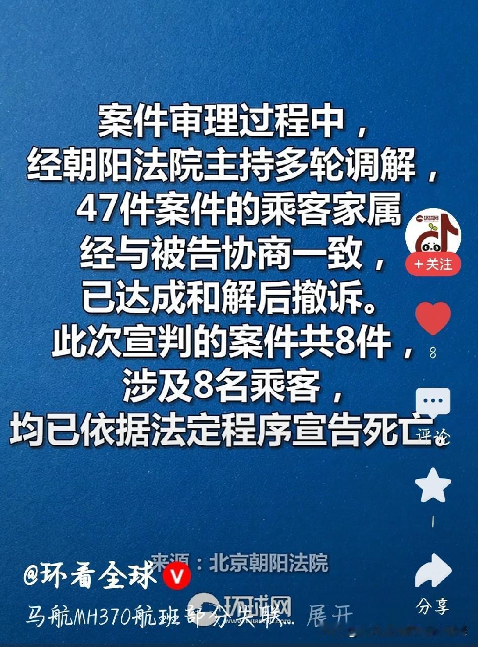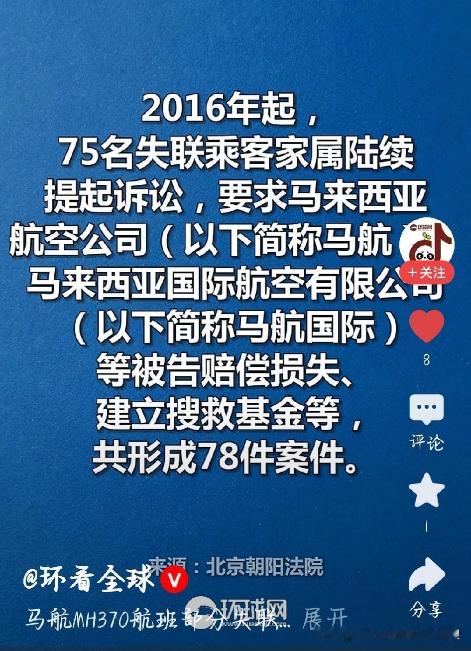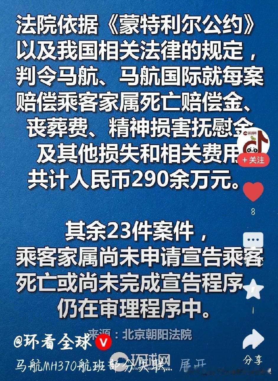 马航MH370家属获赔290万!12年等待,钱换不回真相 等了快12年,马航MH370部分家属终于拿到赔偿!北京朝阳法院宣判,8户家庭每户获赔290多万,可这钱哪能抚平伤痛? 2014年航班失联,239人没了下落,其中154名是中国同胞。家属们从2016年就开始起诉,78件案子拖到现在,有的和解撤诉,有的还在等。 赔偿是到账了,但飞机去哪了、为啥失联,马航至今没给说法。对家属来说,这不是钱的事,是想知道亲人到底遭遇了什么。 这笔迟到的赔偿,只是安慰不是了结。真相不出,心里的坎就永远跨不过去!你们觉得这事儿该就这么算了吗? 马航MH370部分失联乘客家属获赔 马航遇难者 MH370真相何时明 马航MH370家属获赔 370失联 图片截图于环看全球