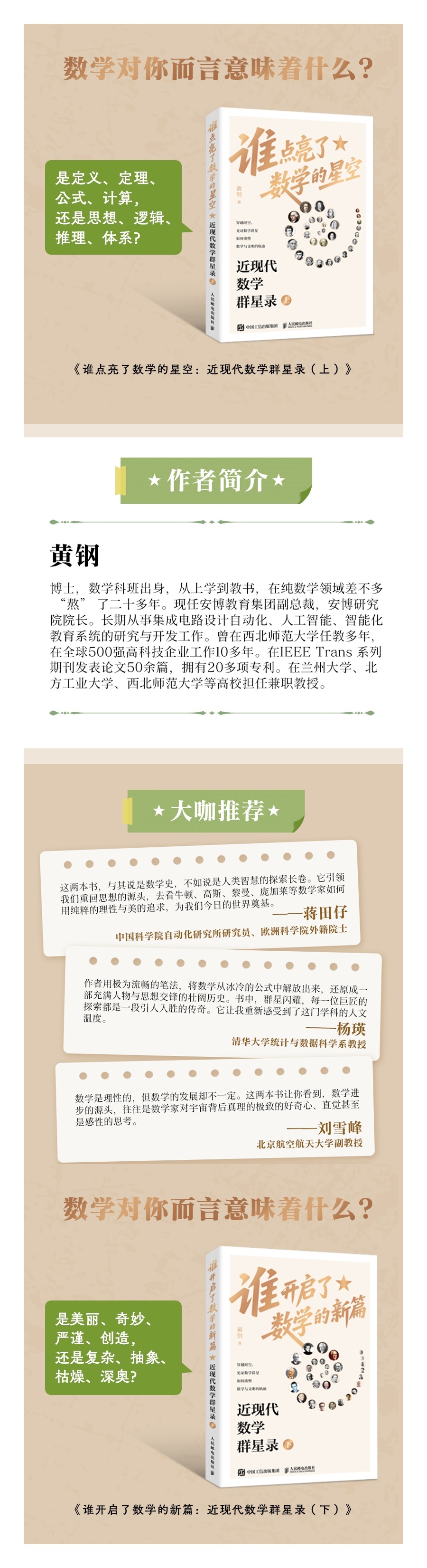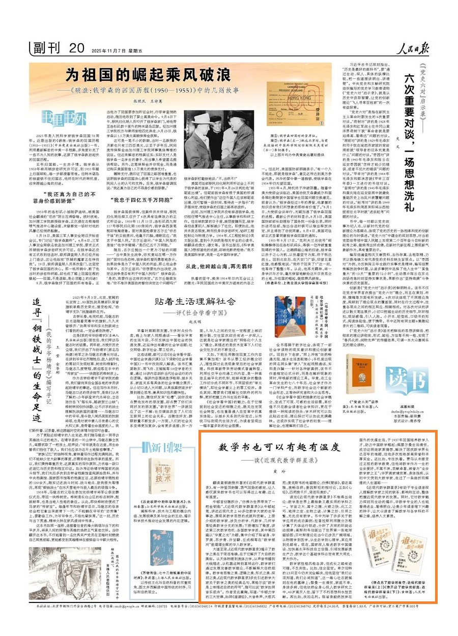 悦读 【数学书也可以有趣有温度 ——读《近现代数学群星录》】 (《人民日报》2025年11月07日 第 20 版) * 《谁点亮了数学的星空:近现代数学群星录(上)》、《谁开启了数学的新篇:近现代数学群星录(下)》, 黄钢 著,人民邮电出版社 2025年10月出版。 作者:爱 玲 翻读黄钢教授所著的《近现代数学群星录》,有一种登顶俯瞰、荡气回肠的感觉,让人感叹原来数学书也可以写得这么有趣、这么有温度。 牛顿首创微积分,“仿佛为世界带来了一把金钥匙”。《近现代数学群星录》从牛顿起笔,讲述近现代史上60多位数学大家的生平事迹,展现其数学思想的成就和贡献。上册介绍的数学家,涉及分析学、代数学、几何学等经典数学分支的发展;下册增加了维度,讲述第三次数学危机、各国数学学派,其中第四篇以“华夏之光”为题,集中介绍了陈省身、华罗庚、苏步青、许宝騄、丘成桐等在“数学银河”里熠熠生辉的华人数学家。 大道至简。《近现代数学群星录》揭示了数学之美在于简洁准确,在于它解开了大自然的奥秘。从天体物理到流体力学,从声音传播到光线描述,从机器运转到星球运行,数学家们通过发展完善数学理论,不断解释大自然规律。数学有思维之美、逻辑之美、形式之美、深刻之美。《近现代数学群星录》多处引述数学大家关于数学之美的经典名句,黑格尔说“数学是上帝描述自然的符号”,雅可比说“数学如同音乐或诗”。作者受此熏陶,写道:“牛顿力学的三大定律,如同《道德经》,大音希声,大哲风范;麦克斯韦的电磁理论,仿佛《楚辞》,姿态高雅,流畅自然;爱因斯坦的相对论,正如《心经》,四两拨千斤,简洁而美妙。” 读完《近现代数学群星录》不难得出结论:数学是世界上最抽象又最实用的学科之一。宇宙之大、离子之微、火箭之快、化工之巧、地球之变、生物之谜、计算之妙、日用之繁,无处没有数学。书中列举了许多关于数学应用的成功案例:拉普拉斯利用微分方程计算了天体运行轨迹,分析了月球的环绕运动规律;高斯和韦伯画出了世界第一张地球磁场图;贝叶斯理论在当今已涉及广阔领域,从物理学到医学,从生态学到心理学,其应用到处都有。现在,国家深入推进数字中国建设、加快高水平科技自立自强、引领发展新质生产力,数学这个基础学科必定有更大用处、更大作为。 数学家性格风格各异,但成长之路有迹可循,不乏共性。比如,信念坚定。希尔伯特的23问至今仍未完全解决,但他坚信“我们必须知道,我们必将知道”,这一雄心壮志就铭刻在他的墓碑上;黎曼一生清贫,家庭不幸,身体多病,但他依然全身心投入数学研究之中,40岁离开人世,留下了不朽思想和永恒贡献。再比如,淡泊名利。陈省身毅然放弃在国外的优渥生活,于1937年回国培养数学人才,助力中国数学崛起;佩雷尔曼生活清贫,成功证明庞家莱猜想,解决了困扰数学界长达百年的难题,但他多次拒绝崇高荣誉和丰厚奖金。还比如,专注执着。费马从未接受过正规的数学教育,但他将数学作为一生的业余爱好,不离不弃,贡献卓著,被誉为“业余数学家之王”;华罗庚家境贫寒、身体残疾,从初中文凭到大数学家,走过了一条曲折而辉煌的人生道路…… 《近现代数学群星录》有助于专业读者深入理解数学家之间的联系、影响和互动,整体把握近现代数学的发展。同时,它对数学魅力深刻而生动的揭示,非数学专业的人也能看得进去、看得明白,让青少年读者埋下兴趣的种子,让大众读者了解数学与各学科的不解之缘,涵养人文素质。 (《人民日报》2025年11月07日 第 20 版:副刊)数学书也可以有趣有温度 * 光明网 -《光明日报》悦读频道 分享链接:数学书也可以有趣有温度——读《近现代数学群星录》