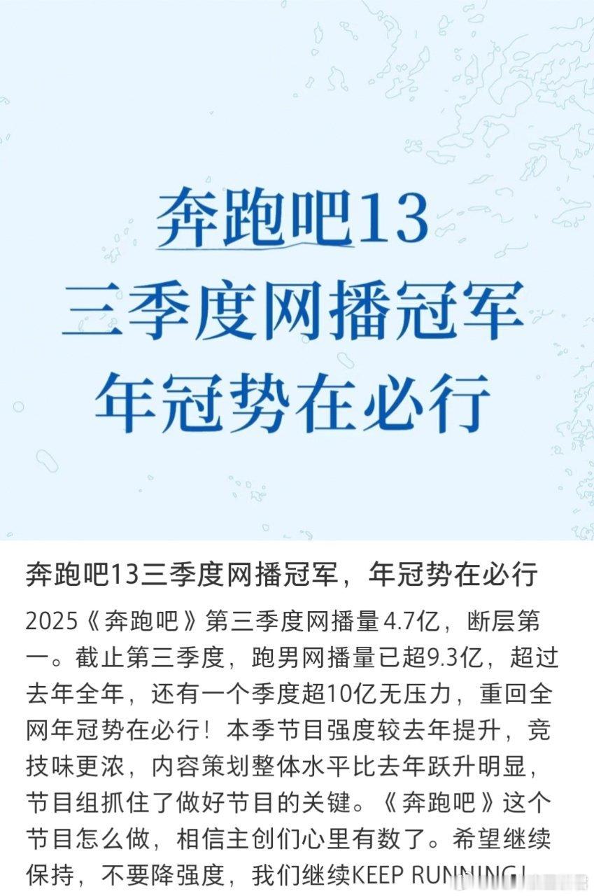 跑男有望夺下今年综艺年冠奔跑吧 前三季度网播量已超9.3亿,三季度以4.7亿强势领跑!不断进化的内容,既有激烈游戏也有暖心时刻,牢牢抓住观众。冠军相十足,年度综艺王者之位正在招手!