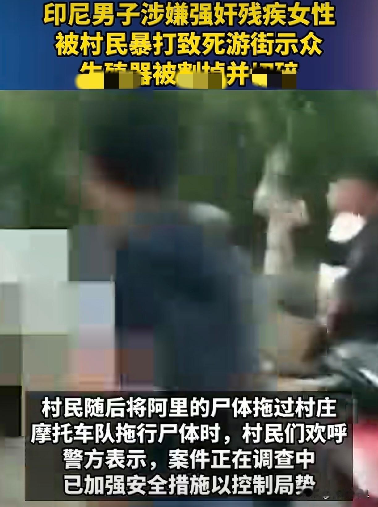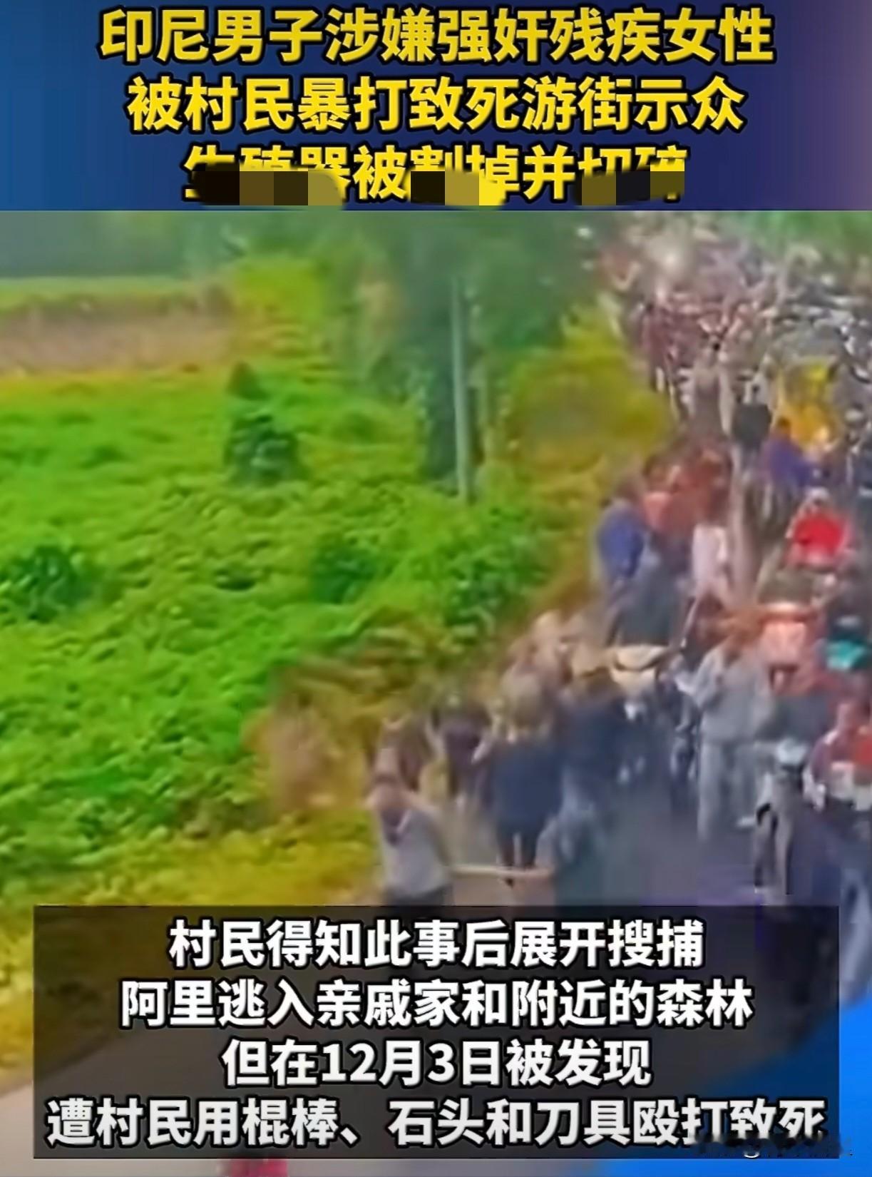 在11月30日,一个印尼男子性侵了一名残疾女子。村民在得知此事后,展开了搜捕。抓住男子之后,直接动用了私刑。男子被活活打死,作案工具也被割掉,最后被拖到街上游行示众。 说实话,愤怒完全能够理解,但以暴制暴,用如此残忍的手段去动用私刑,确实不太可取,很容易出冤案。 在当地,如果被冤枉了,怕是没有机会为自己辩解。只能说这种事情还是交由司法系统处理才是比较公正合理的。