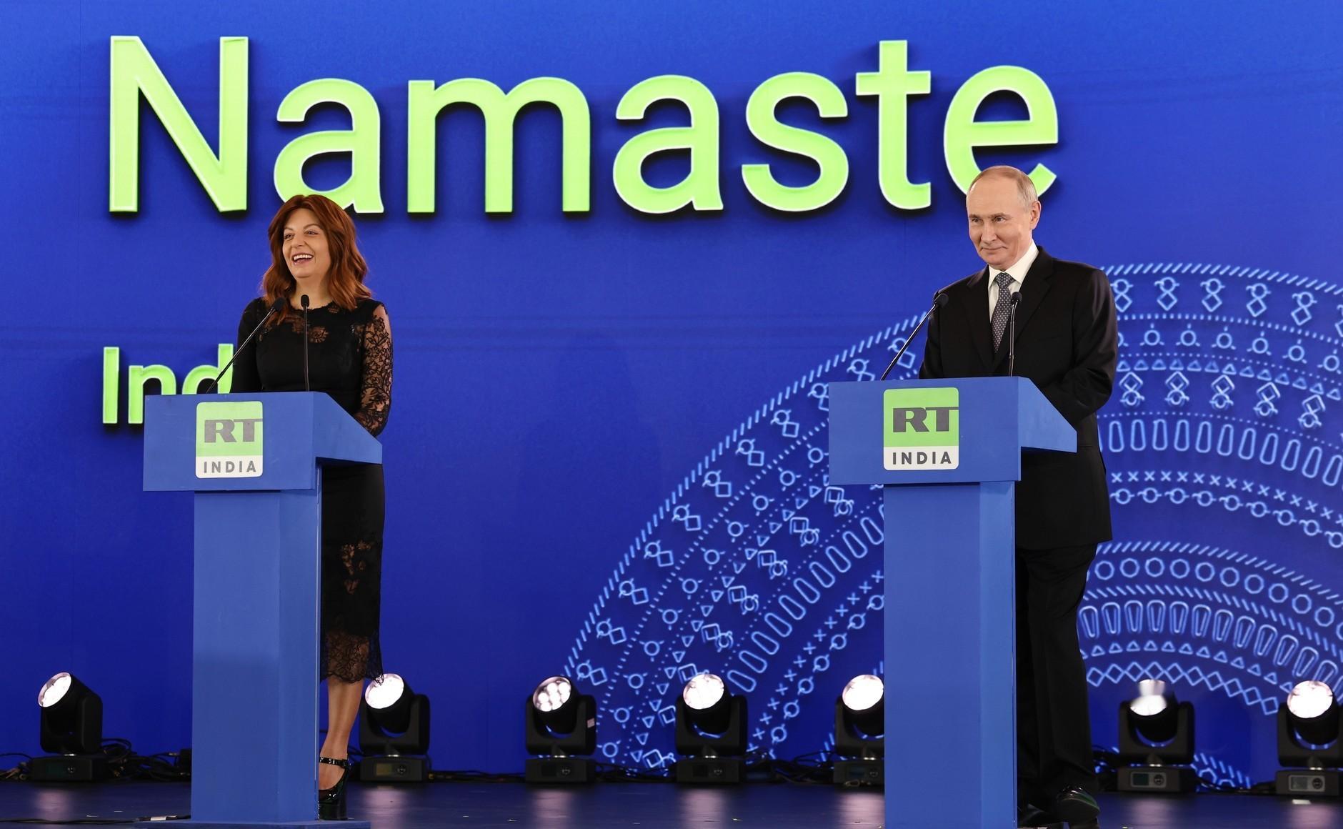 瓦洛佳小朋友 印度RT频道开播仪式在印度新德里,弗拉基米尔·普京与“今日俄罗斯”国际新闻通讯社总编辑玛格丽塔·西蒙尼扬共同出席了印度RT频道的开播仪式。2025年12月5日 15:00新德里