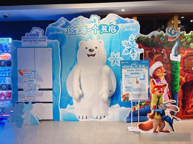 将这些IP联名家电从概念推向家居的关键,在于线下零售商的场景化运营。卖场不再只是产品的陈列馆,而是通过打造主题体验空间,让购买成为一种发现与互动的过程。例如,在苏宁易购门店,苏宁易购为美的和迪士尼《疯狂动物城2》联名的“熊墩墩”冰箱落地快闪活动,走进以朱迪、尼克为主题的“熊抱专区”,消费者能亲手拉开“熊墩墩”冰箱门,感受“新鲜冷藏”的冒险故事。通过打卡互动,消费者还可获得联名周边和电影票,让买东西像逛游园会一样有趣。