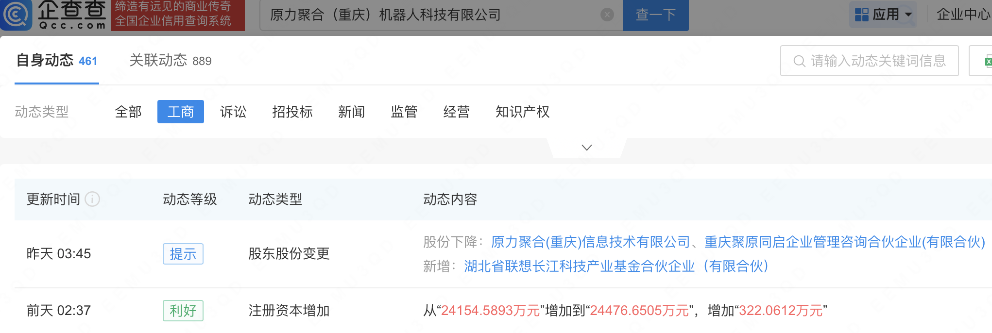 企查查APP显示,近日,原力聚合(重庆)机器人科技有限公司发生工商变更,新增湖北省联想长江科技产业基金合伙企业(有限合伙)为股东,同时注册资本增至约2.45亿元。企查查信息显示,该公司成立于2024年,经营范围包含:人工智能应用软件开发;人工智能基础软件开发;智能机器人的研发;工业机器人制造等。