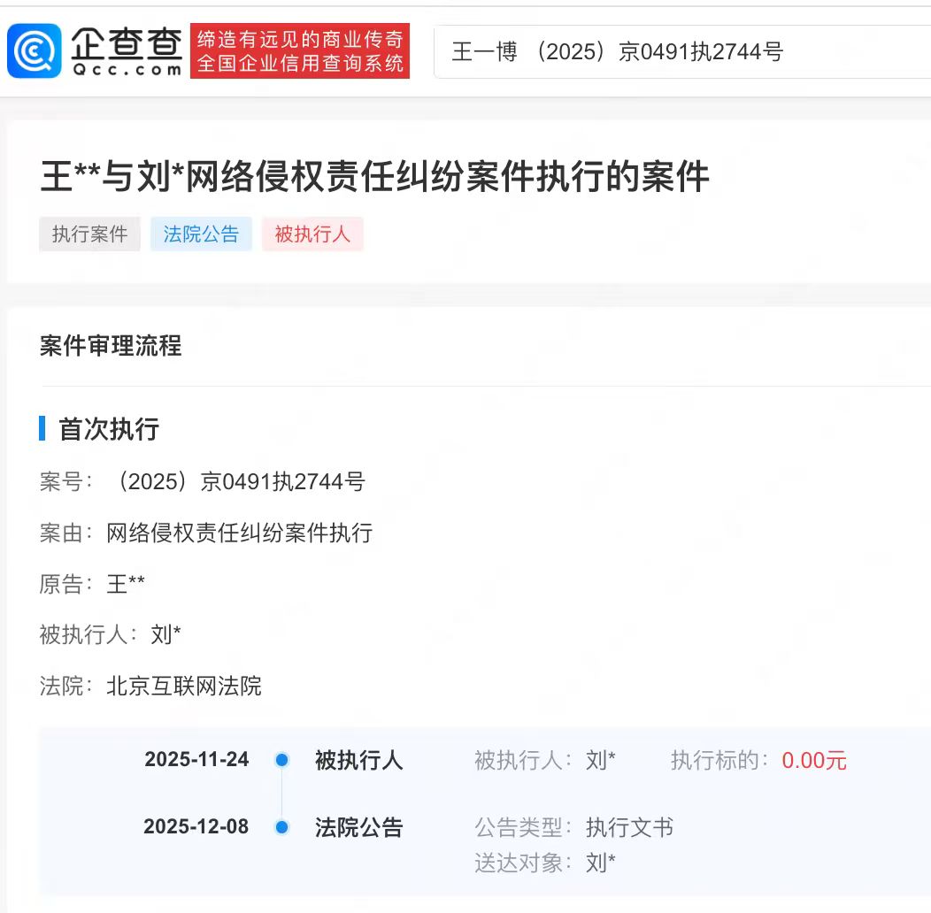 企查查APP显示,12月8日,法院刊登王一博与刘某网络侵权责任纠纷民事判决书。法院认为被告发布的涉案评论针对使用了人身攻击性侮辱词汇、没有事实依据的不当陈述。构成对原告的侮辱、诽谤行为。法院判决刘某在涉案账号上公开发布致歉声明,赔偿王一博经济损失等2.5万元。