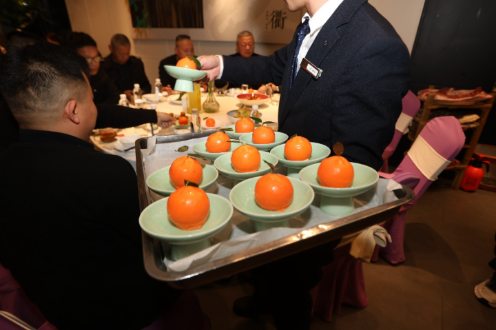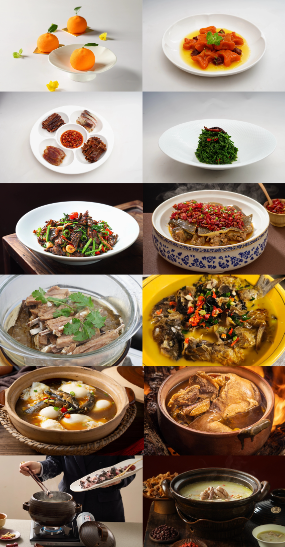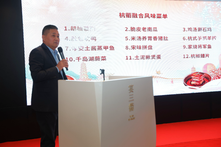 12道“杭衢融合风味菜单”分别是:胡柚慕斯、脆皮老南瓜、鸡汤涮石鸡、肚包杭鸭、米汤养胃香猪肚、杭式手抓羊排、淳安土酱蒸甲鱼、宋味拼盘、家烧将军鱼、千岛湖蕨菜、土泥鳅煲蛋、杭椒鳝片。