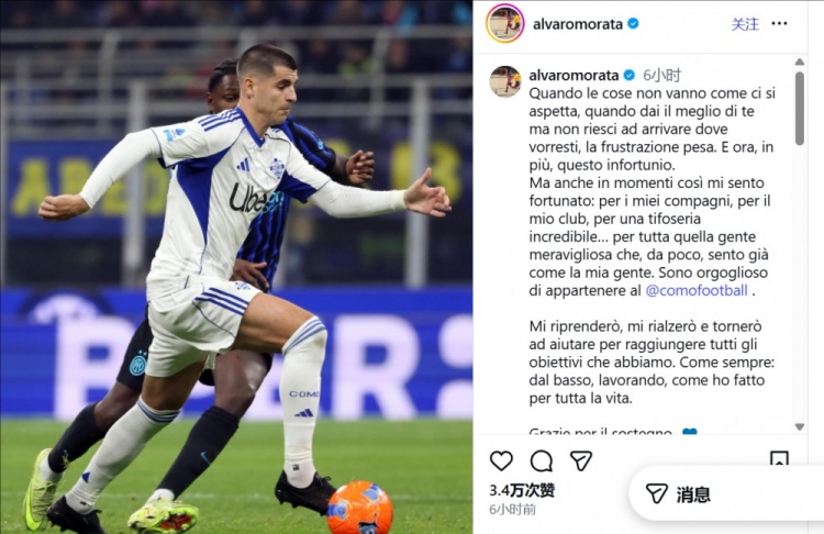 “但即便在这样的时刻,我依然觉得自己很幸运:因为我的队友、我的俱乐部、那支不可思议的球迷团体……也因为那些美好的人们,尽管相识不久,我已经感觉到他们就像是我的人。我为能够成为科莫的一员而感到骄傲。”