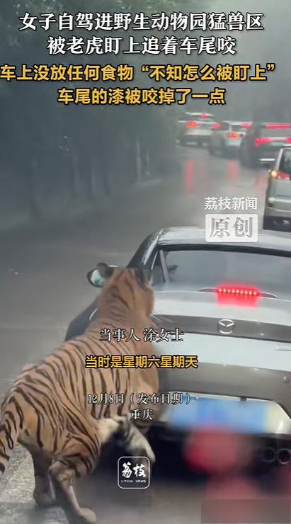 12月7日,重庆一女子自驾进动物园猛兽区,被老虎一路跟车,咬掉车漆。女子表示,这个动物园是可以自驾进猛兽区看动物的,可能因为自己的车是最矮小的,所以老虎追着咬,后面就只被咬掉了一点漆。