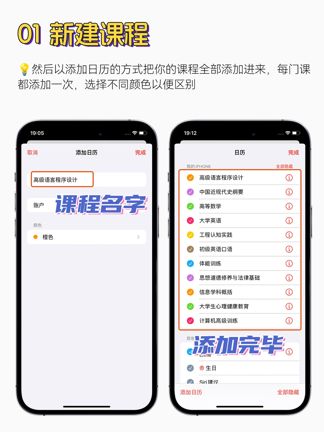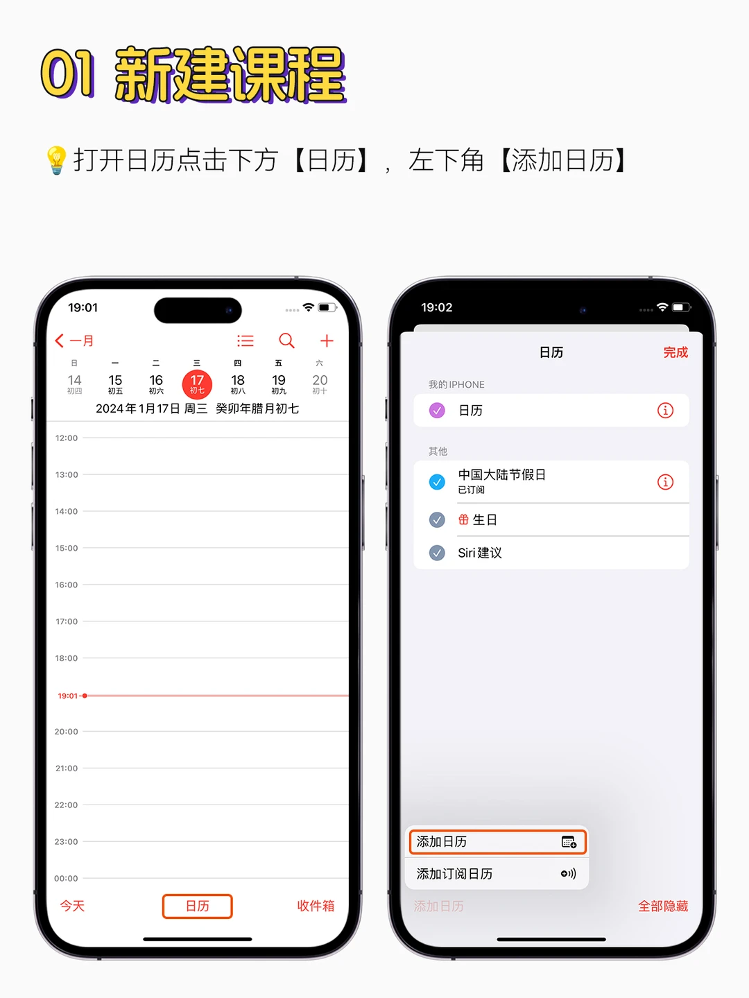 1️⃣打开日历点击下方【日历】,然后以添加日历的方式把你的课程全部添加进来,每门课都添加一次,选择不同颜色以便区别。