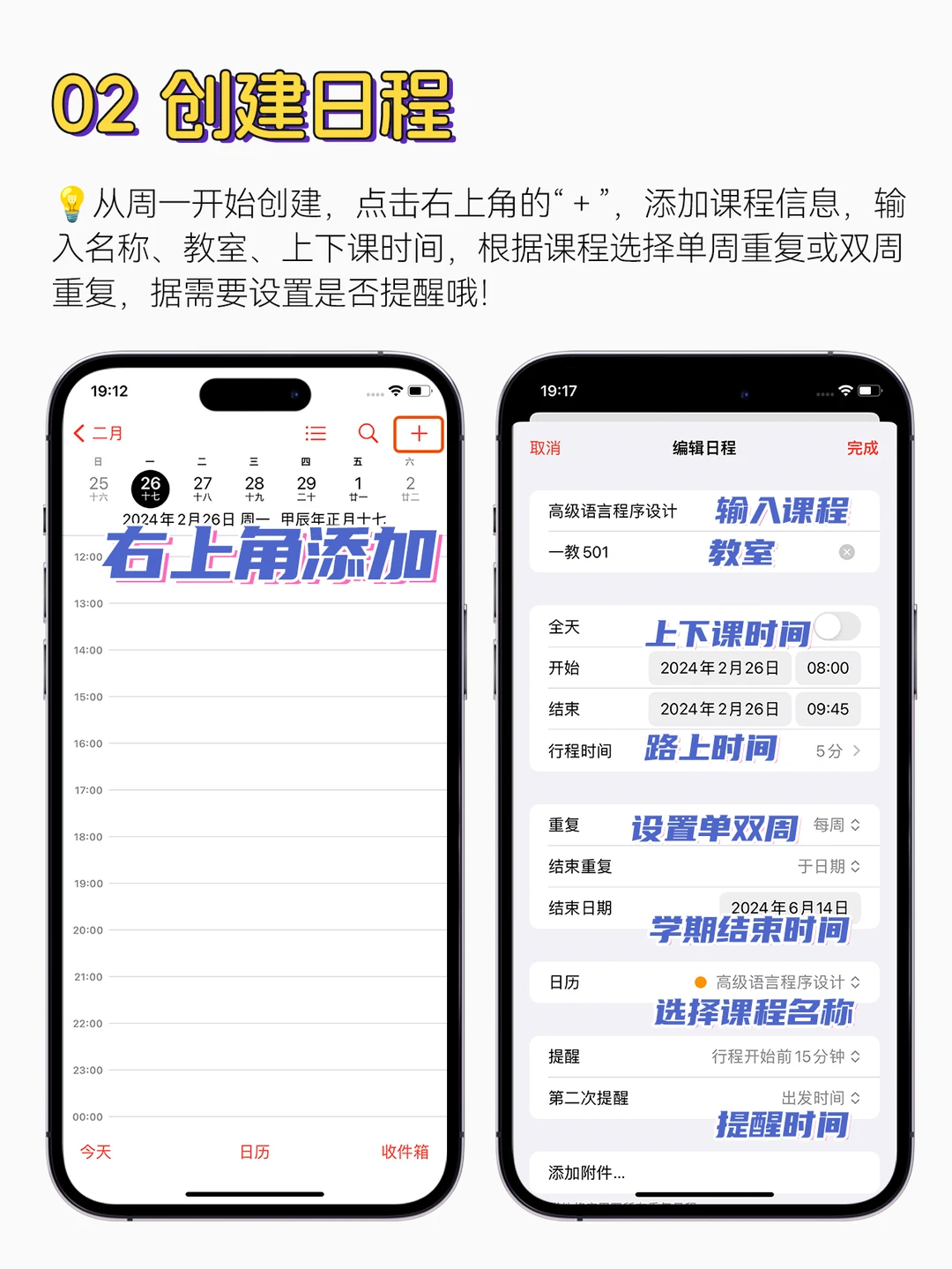 2️⃣从周一开始创建,点击右上角的“+”,添加课程信息,输入名称、教室、上下课时间,根据课程选择单周重复或双周重复,据需要设置是否提醒哦!