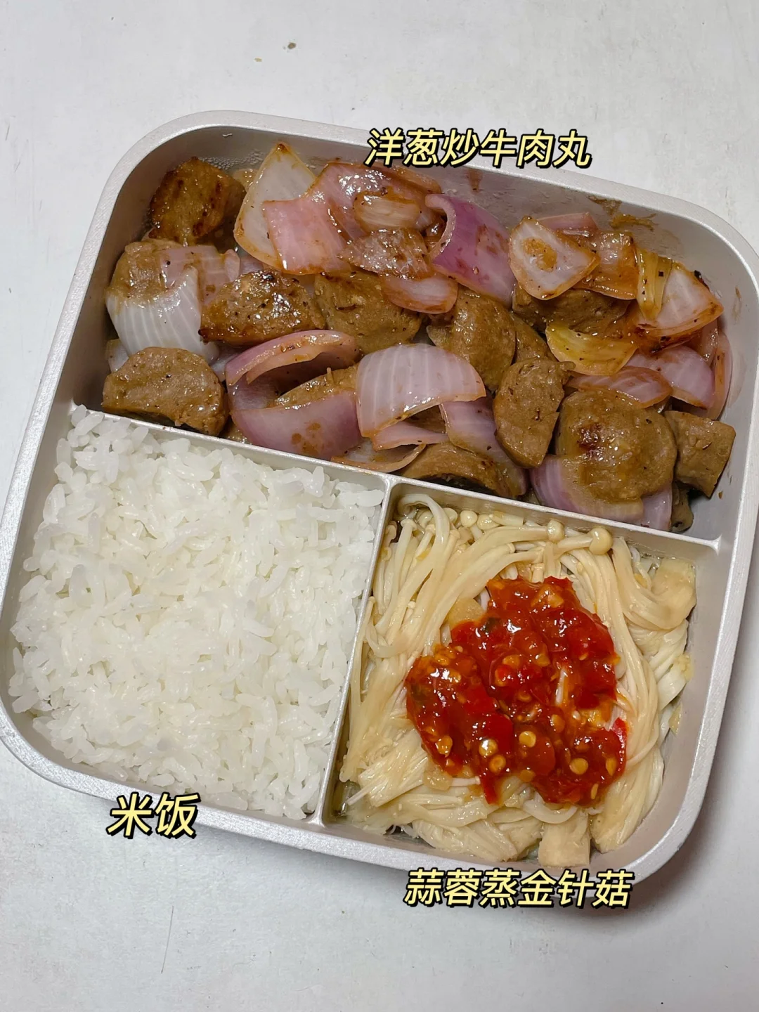 📍米饭+洋葱炒牛肉丸+蒜蓉金针菇
