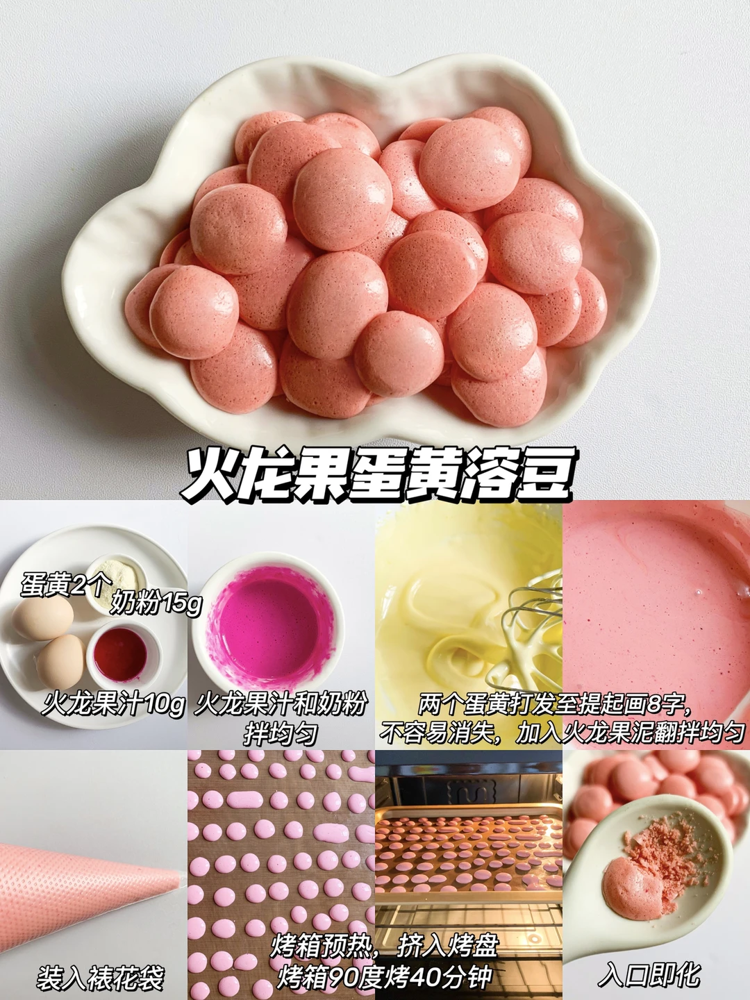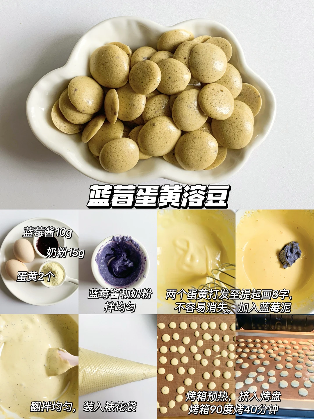 今天分享没有添加蛋白溶豆,蛋白过敏的宝宝也可以食用哦,小小溶豆很合适锻炼宝宝的抓握能力,入口即化。蛋黄版的溶豆,麻麻们快给宝宝安排吧[飞吻R] 🌟溶豆做法公式:2个蛋黄➕10克果蔬泥➕15克左右奶粉(根据果蔬泥的稠度不同来调整奶粉的量) . ✅原味蛋黄溶豆 【食材】蛋黄2个、奶粉15克 ✅番茄蛋黄溶豆 【食材】蛋黄2个、番茄酱10克、奶粉15克 ✅红枣蛋黄溶豆 【食材】蛋黄2个、红枣泥10克、奶粉15克 ✅火龙果蛋黄溶豆 【食材】蛋黄2个、火龙果汁10克、奶粉15克 ✅蓝莓蛋黄溶豆 【食材】蛋黄2个、蓝莓酱10克、奶粉15克 ✅菠菜蛋黄溶豆 【食材】蛋黄2个、菠菜汁10克、奶粉15克 - 🔎详细做法请看图3-8 🌈小贴士: 1⃣️入口即化的溶豆切记要把蛋黄打发至划八字不容易消失,加入果酱的时候要用翻版的手法,拌均匀 2⃣️怎么判断溶豆熟了,烤完后可以轻松从油纸脱落,整体是硬的状态(每个烤箱脾气不同可根据自家烤箱调节,如果没熟可以延长时间再烤一会 3⃣️开始前准备工作先做好,烤盘先铺好油纸,挤豆豆的时候开始预热烤箱,这样不会中途手忙脚乱。 4⃣️做好的溶豆出炉后三四分钟就可以放入密封罐保存,不容易回潮 7个月宝宝辅食|8个月宝宝辅食|9个月宝宝辅食|10个月宝宝辅食|一岁宝宝辅食|自主进食|手指食物