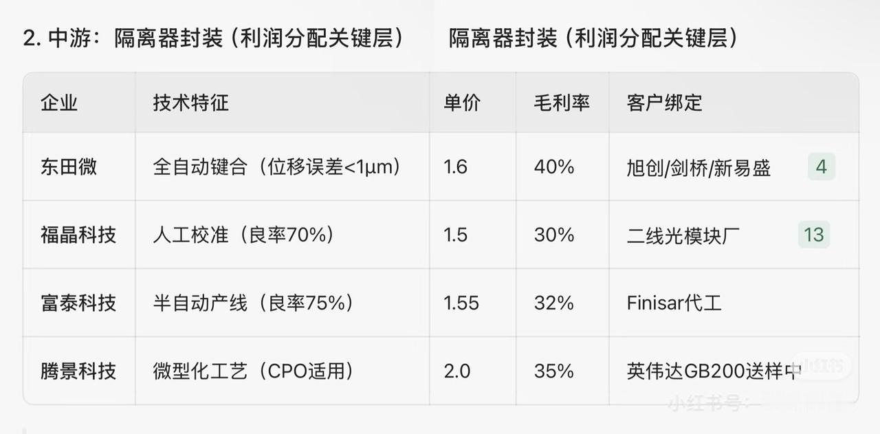 光模块“隐形阀门”,隔离器供需 一、核心功能:光信号的“交通警察” 隔离器(Optical Isolator)是光模块中的关键无源器件,核心作用: • 防止光反射:阻断后端光纤反射的光信号(强度达入射光5-10%),避免干扰激光器; • 提升信噪比:典型插入损耗<0.5dB(行业标准1dB),消光比>35dB(核心指标); • 必配属性:每只短距光模块需配8个隔离器(长距需2个),缺货将导致光模块停产。 1. 垂直整合者:东田微(关键标签) • 优势:绑定Coherent旋片供应(月采购3万片) + 自研偏振片降本15%; • 风险:若Coherent断供(概率20%),产能利用率将暴跌至30%。 2. 技术突破者:腾景科技 • CPO布局:已通过英伟达GB200的热循环测试(-40℃~125℃ 1,000次); • 弹性:若2026年CPO渗透率达10% → 微型隔离器收入占比超50%。