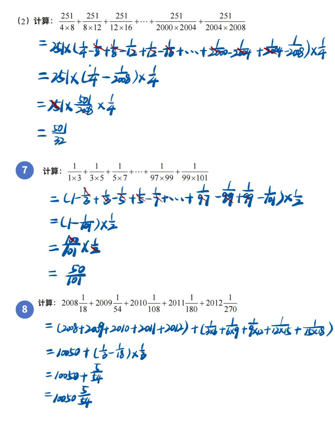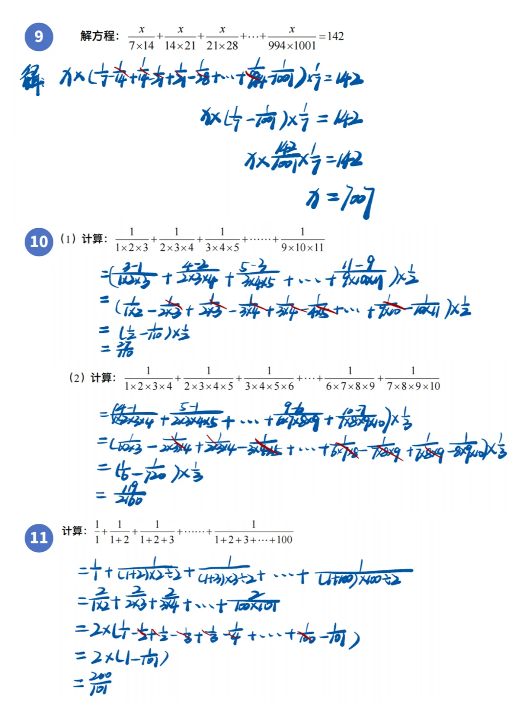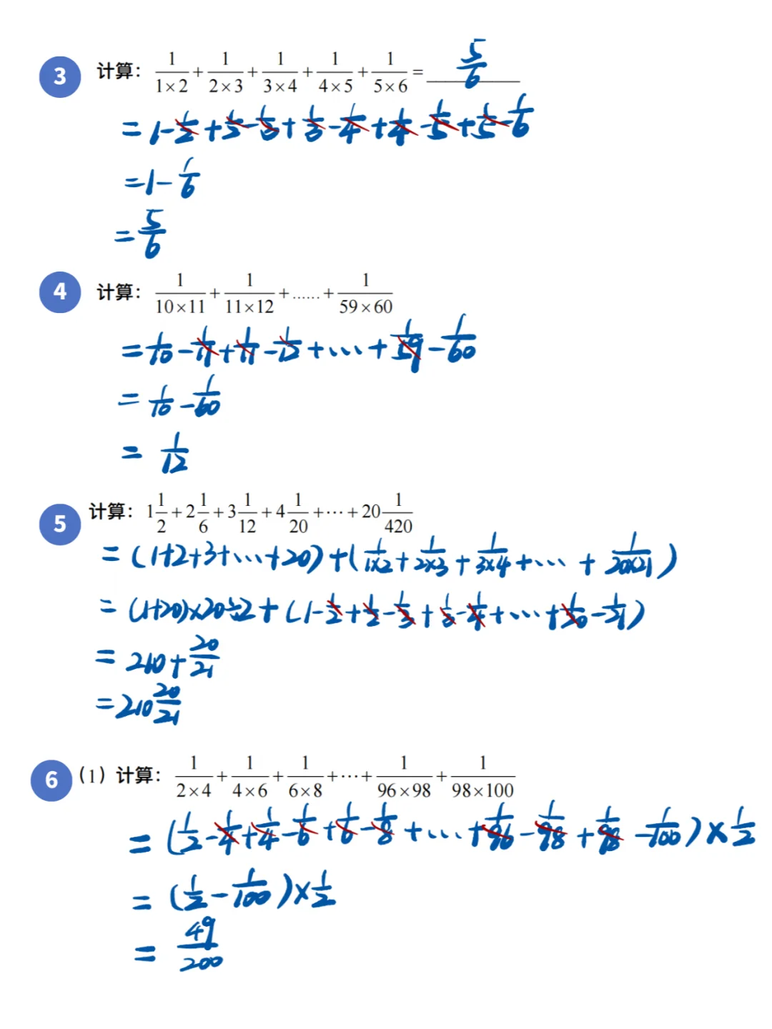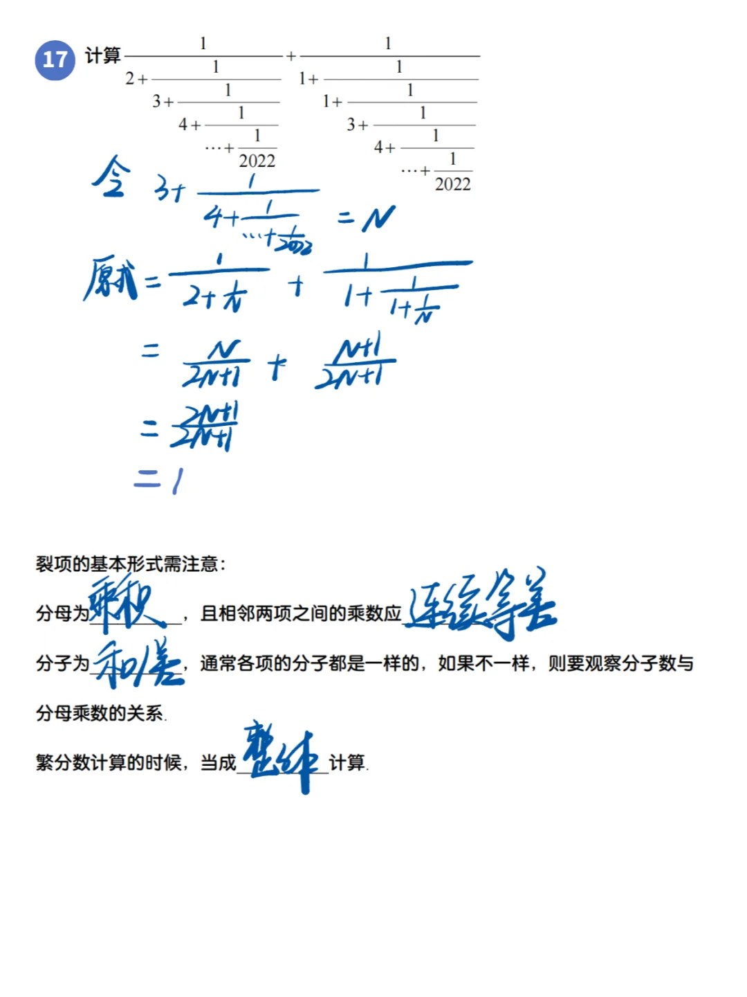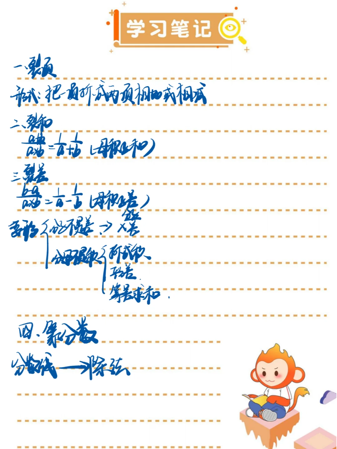 🌈裂项 形式:把一项拆成两项相加或相减; 实质:异分母分数加减法的逆运算; 目的:通过加减抵消或凑整,简化计算。 🌈裂差 特点:分母是两个数的乘积,分子是两个数的差,简而言之“母积子差”。 注意:若分子不是分母两个因数之差,需要调整系数。 🌈裂和 特点:分母是两个数的乘积,分子是两个数的和。简而言之,“母积子和” 注意:若分子不是分母两个因数之和,需要调整系数。 🌈繁分数 繁分数看成除法算式,进行计算。