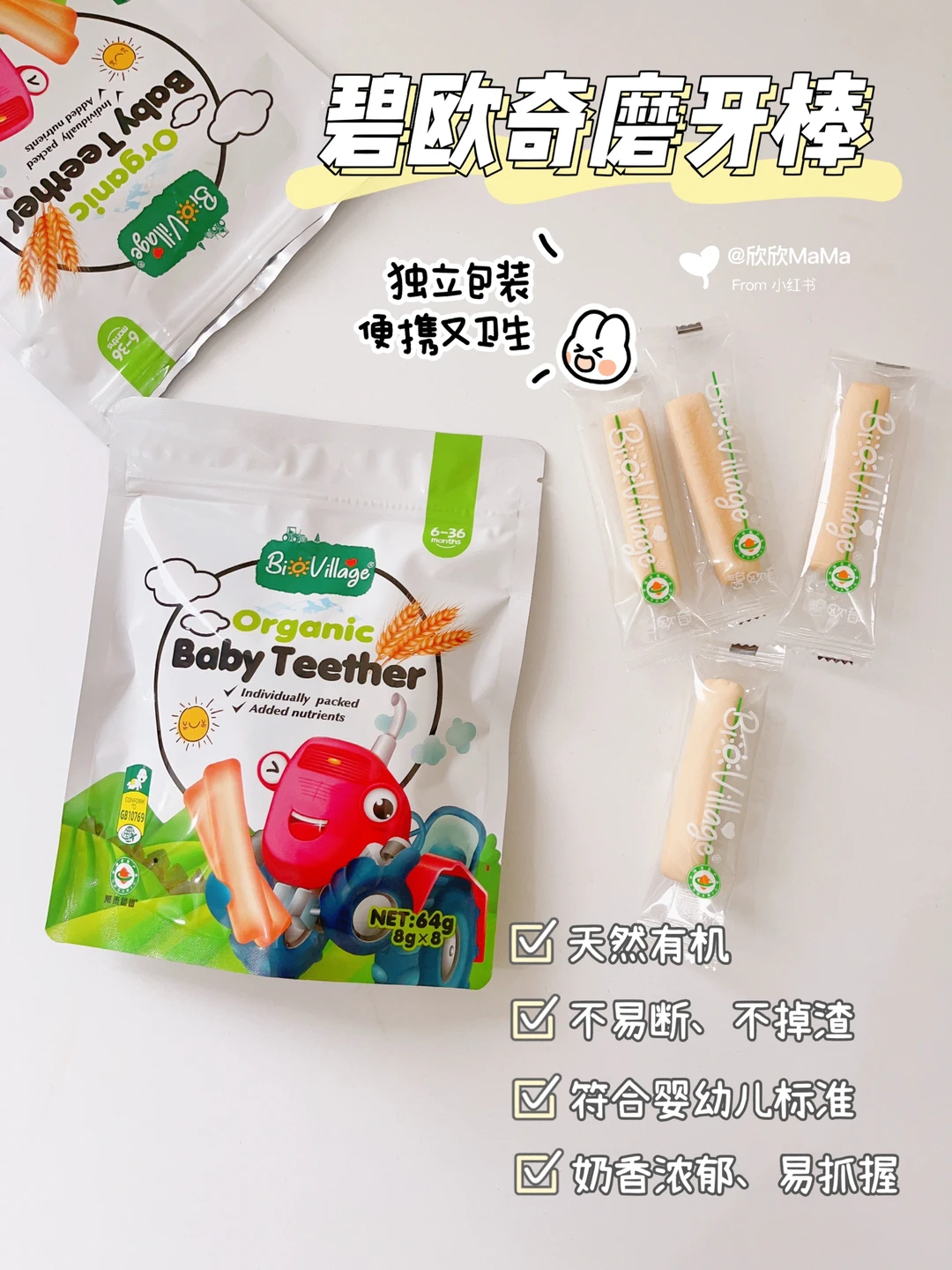 我家宝宝长牙期入手的是碧欧奇的磨牙棒,选它原因是因为硬度很合适,不会掉渣也不容易折断,很适合来给宝宝磨牙。它单根磨牙棒可抗压10kg力,相当于可承重一袋大米的重量,在宝宝啃咬的过程中更加安全放心!并且在和面过程中只用纯牛奶和面,不添加一滴水,100g磨牙棒蛋白质含量为14.9g/100g,奶香浓郁,越磨越香,宝宝很爱吃呢。