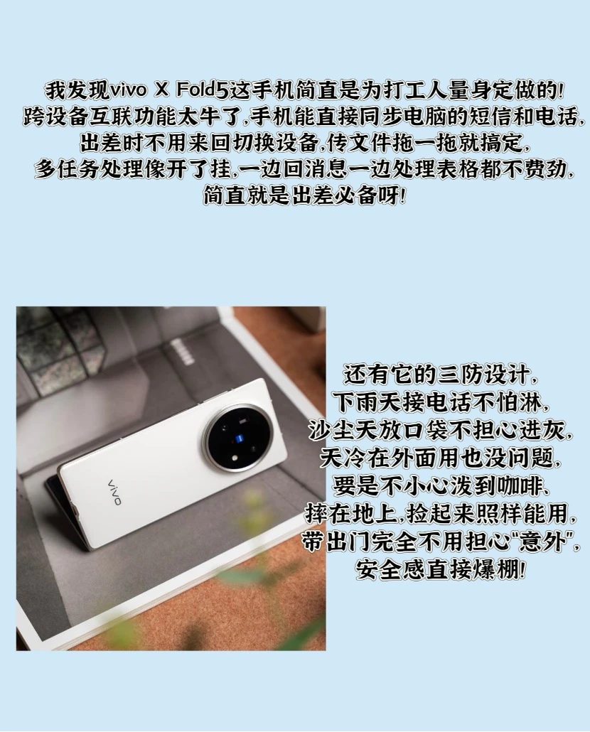 我发现vivo X Fold5这手机简直是为打工人量身定做的!跨设备互联功能太牛了,手机能直接同步电脑的短信和电话,出差时不用来回切换设备,传文件拖一拖就搞定,多任务处理像开了挂,一边回消息一边处理表格都不费劲,简直就是出差必备呀!