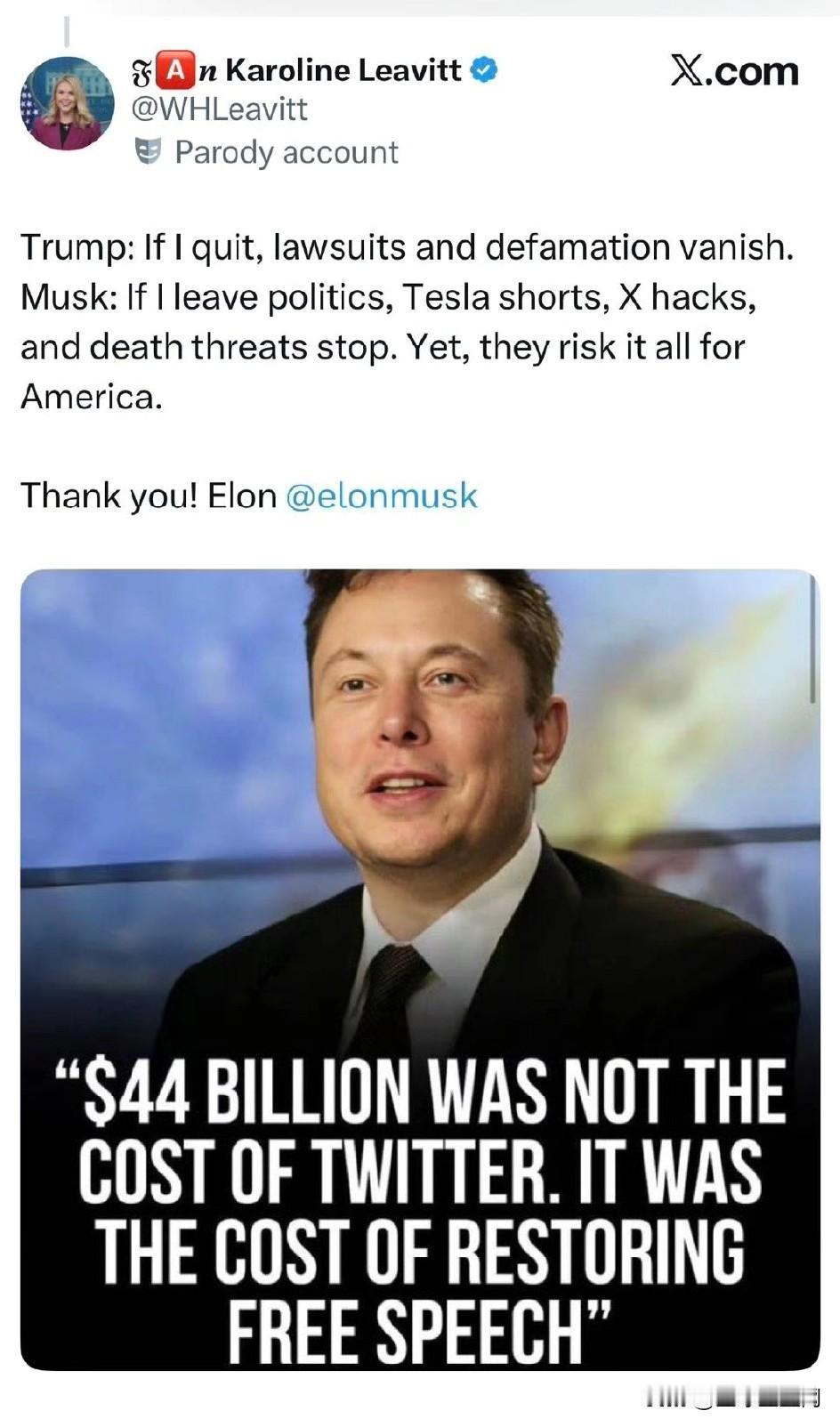川普:如果我辞职,诉讼和诽谤就会消失。 马斯克:如果我离开政治,做空特斯拉、X黑客和死亡威胁就会停止。 然而,他们为美国冒着一切风险。 谢谢你!埃隆 [爱慕]