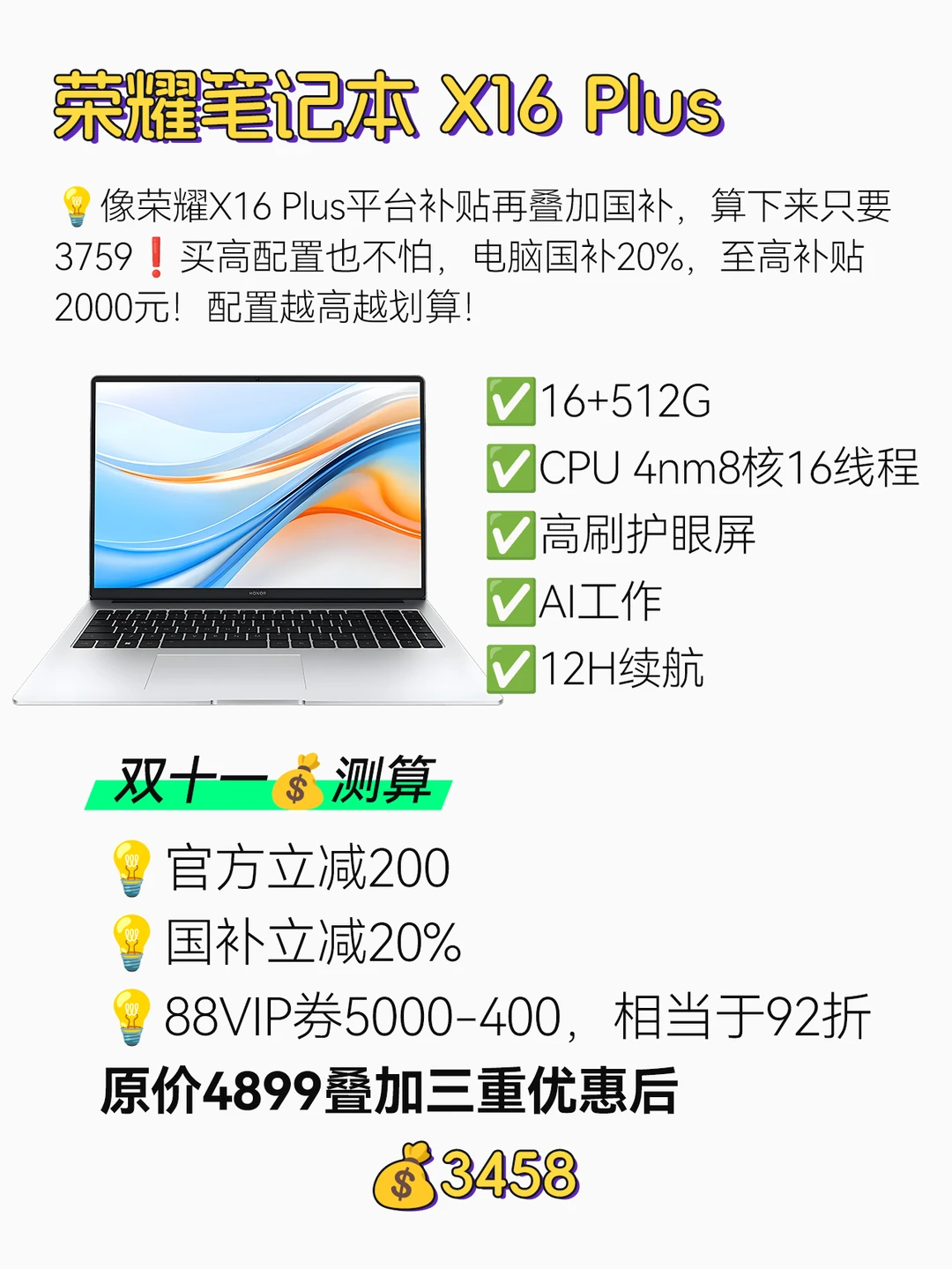 进会场先领补贴🔥像荣耀X16 Plus平台补贴再叠加国补,算下来只要3759❗买高配置也不怕,电脑国补20%,至高补贴2000元🔥配置越高越划算,这时候还不赶紧薅羊毛?