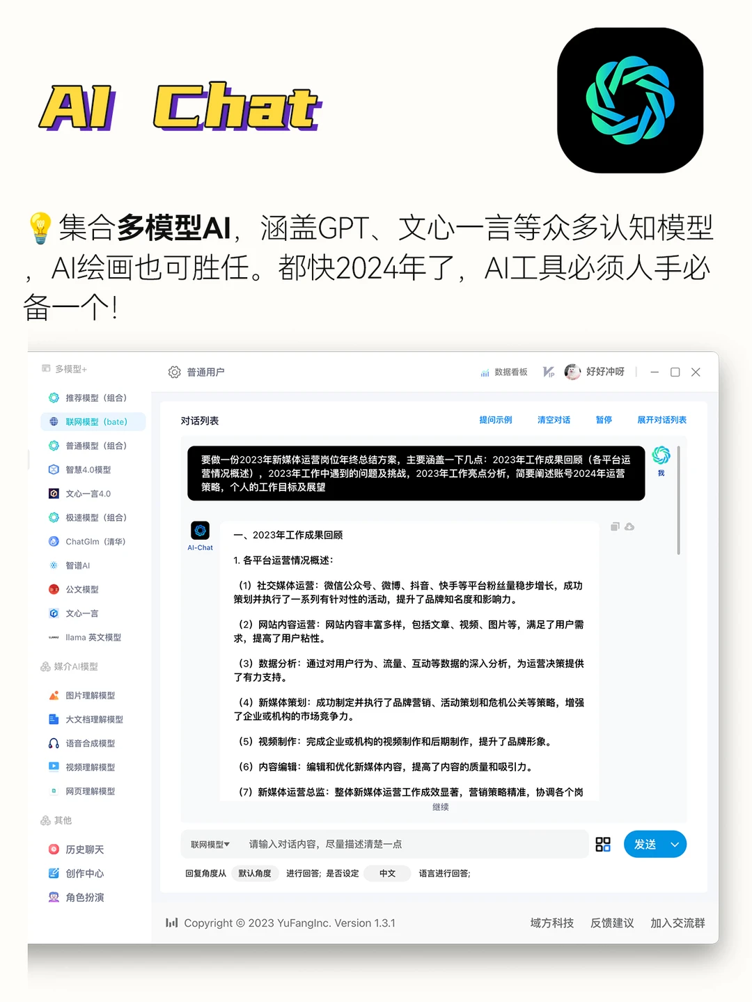 集合多模型AI,涵盖GPT、文心一言等众多认知模型,AI绘画也可胜任。都快2024年了,AI工具必须人手必备一个!