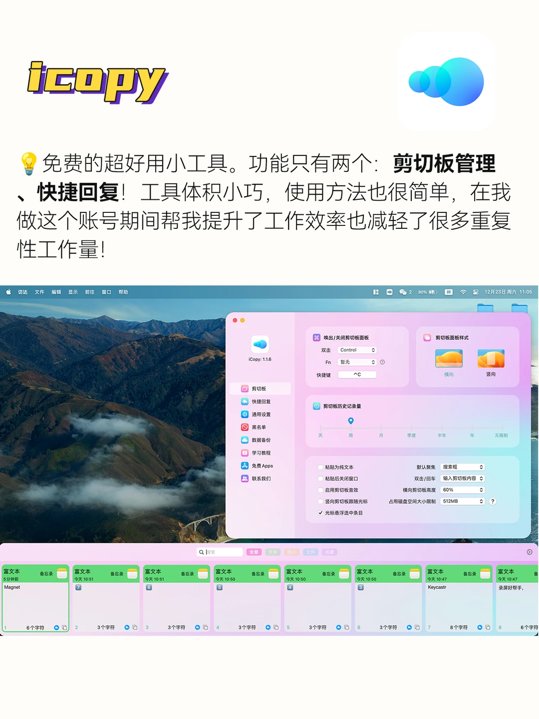 免费的超好用小工具。功能只有两个:剪切板管理、快捷回复!工具体积小巧,使用方法也很简单,在我做这个账号期间帮我提升了工作效率也减轻了工作量!