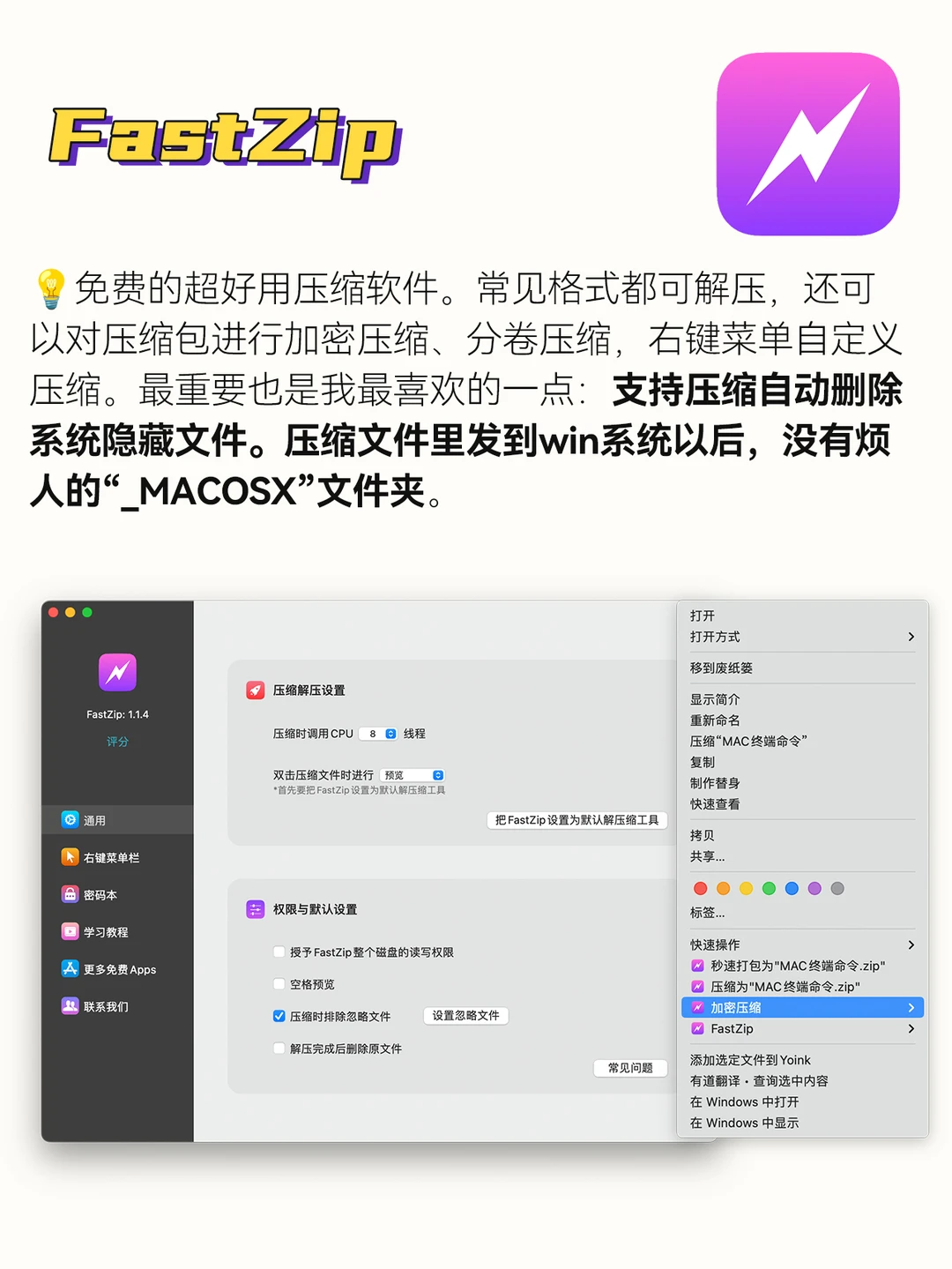 免费的超好用压缩软件。常见格式都可解压,还可以对压缩包进行加密压缩、分卷压缩,右键菜单自定义压缩。最重要也是我最喜欢的一点:支持压缩自动删除系统隐藏文件。压缩文件里发到win系统以后,没有烦人的“_MACOSX”文件夹。