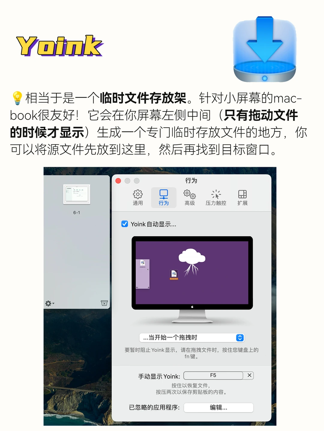 相当于是一个临时文件存放架。针对小屏幕的macbook很友好!它会在你屏幕左侧中间(只有拖动文件的时候才显示)生成一个专门临时存放文件的地方,在拖放的时候你可以将源文件先拖放到这里,然后再找到目标窗口。