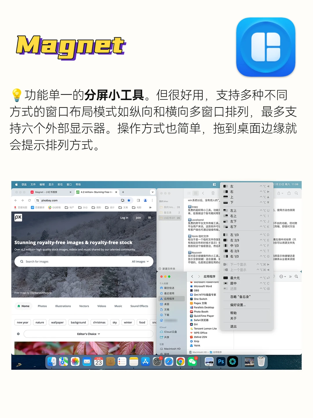 功能单一的分屏小工具。但很好用,支持多种不同方式的窗口布局模式如纵向和横向多窗口排列,最多支持六个外部显示器。操作方式也简单,拖到桌面边缘就会提示排列方式。