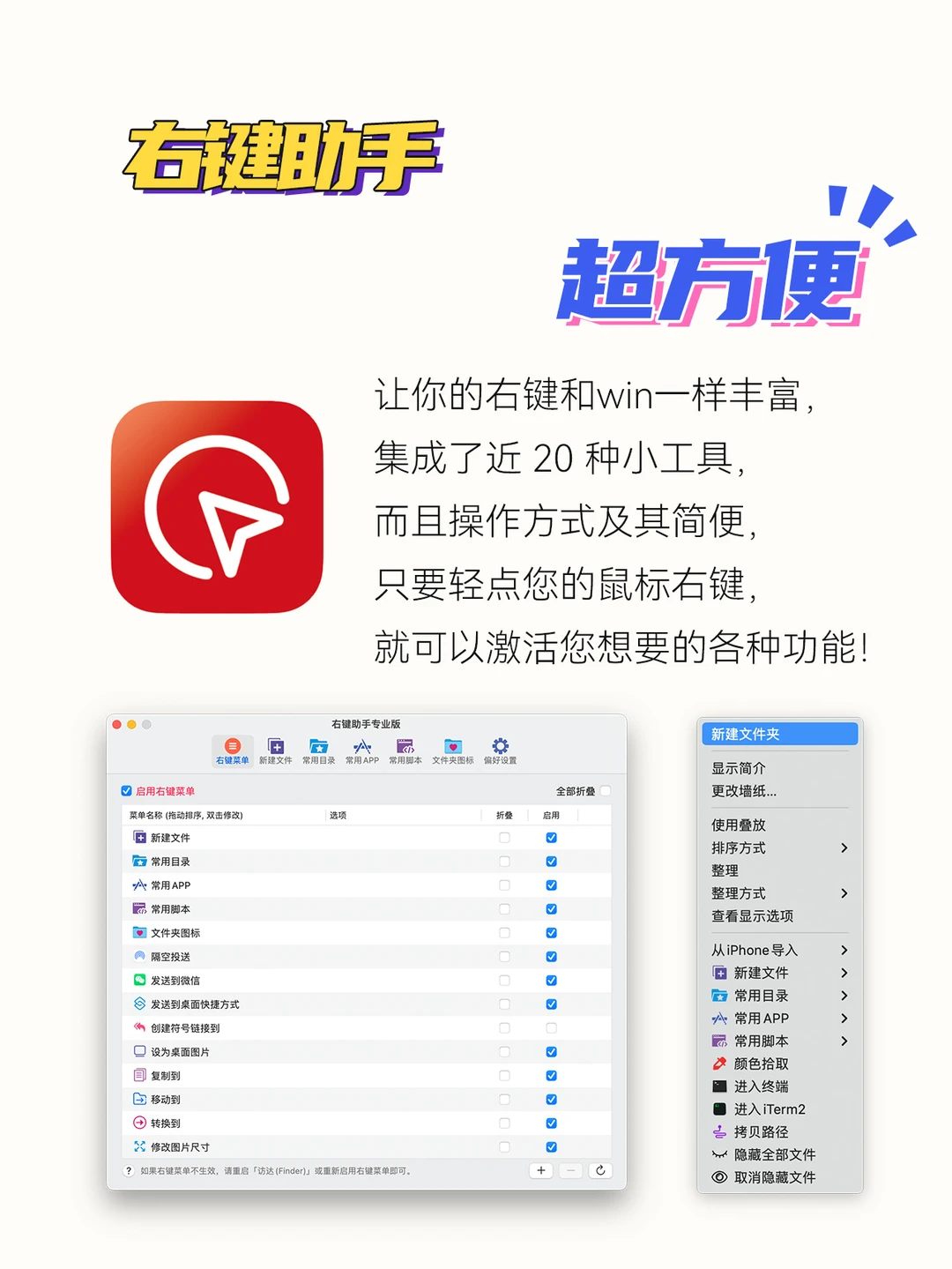 偶尔是不是嫌弃Mac右键功能少?这款App可以让你的右键和win一样丰富,超好用!集成了近 20 种小工具,而且操作方式及其简便,只要轻点鼠标右键,就可以激活你想要的各种功能!