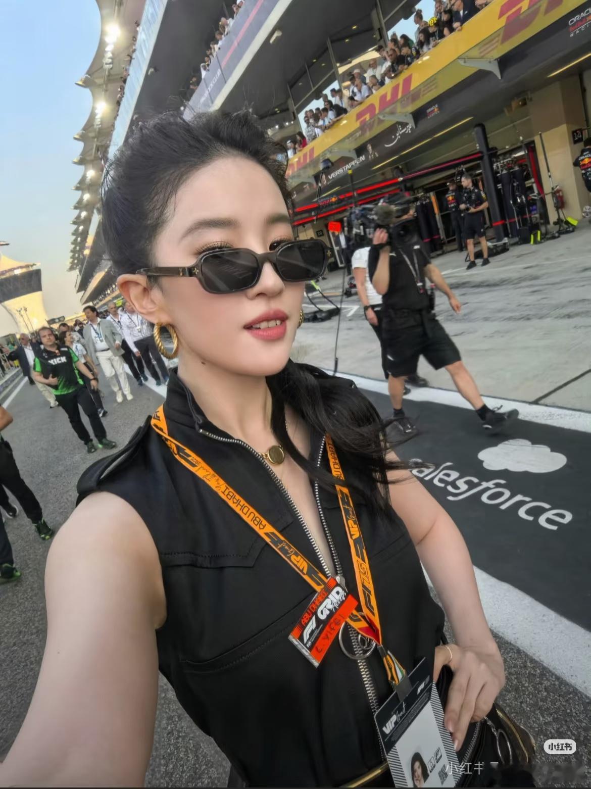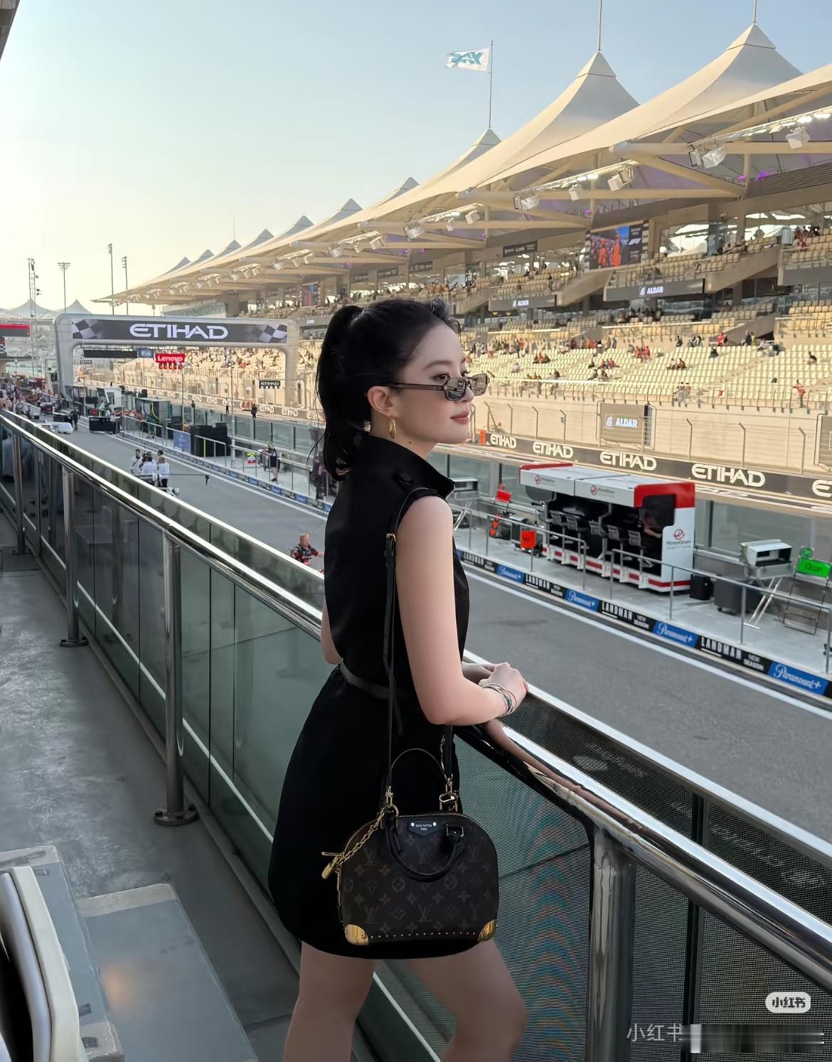 F1阿布扎比大奖赛的观赛活动上的刘亦菲,高马尾+黑色无袖束腰裙+黑墨镜,身材和外