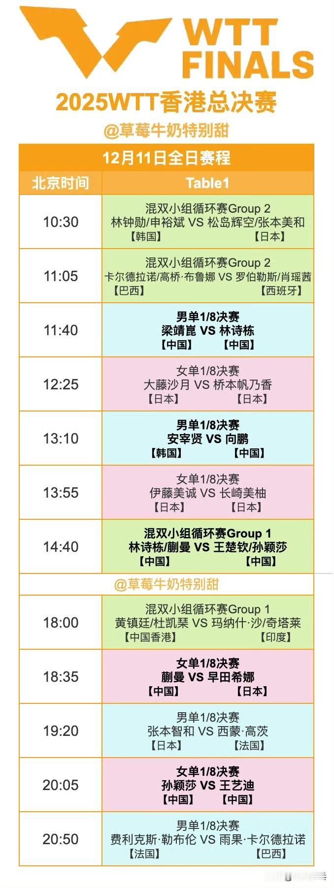 12月11日全日赛程P2 国乒赛程如下: 11:40 T1 梁靖崑🇨🇳VS林诗栋🇨🇳 13:10 T1 向鹏🇨🇳VS安宰贤🇰🇷 14:40 T1 林诗栋/蒯曼🇨🇳VS王楚钦/孙颖莎🇨🇳 18:35 T1 蒯曼🇨🇳VS早田希娜🇯🇵 20:05 T1 孙颖莎🇨🇳VS王艺迪🇨🇳