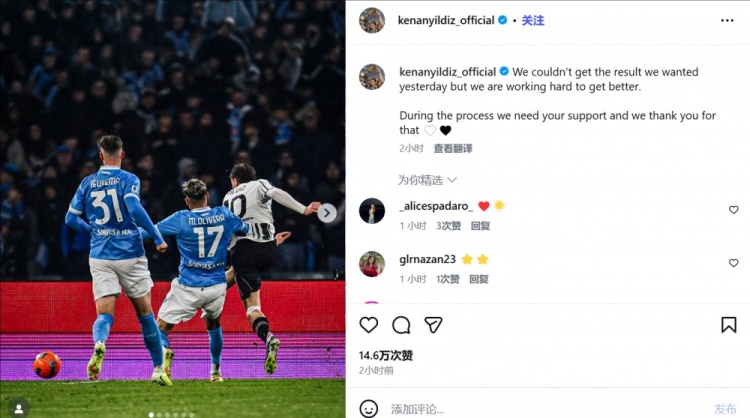 直播吧12月9日讯在尤文1-2输给那不勒斯后,打进尤文唯一进球的伊尔迪兹更新社交媒体,呼吁球迷继续支持尤文。