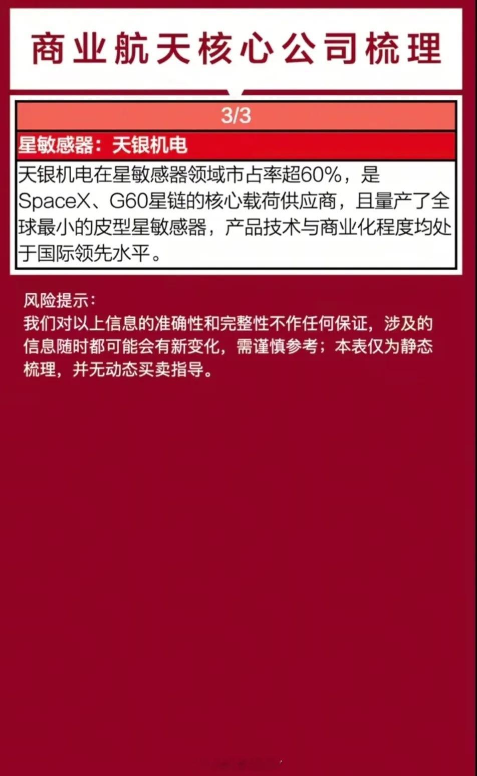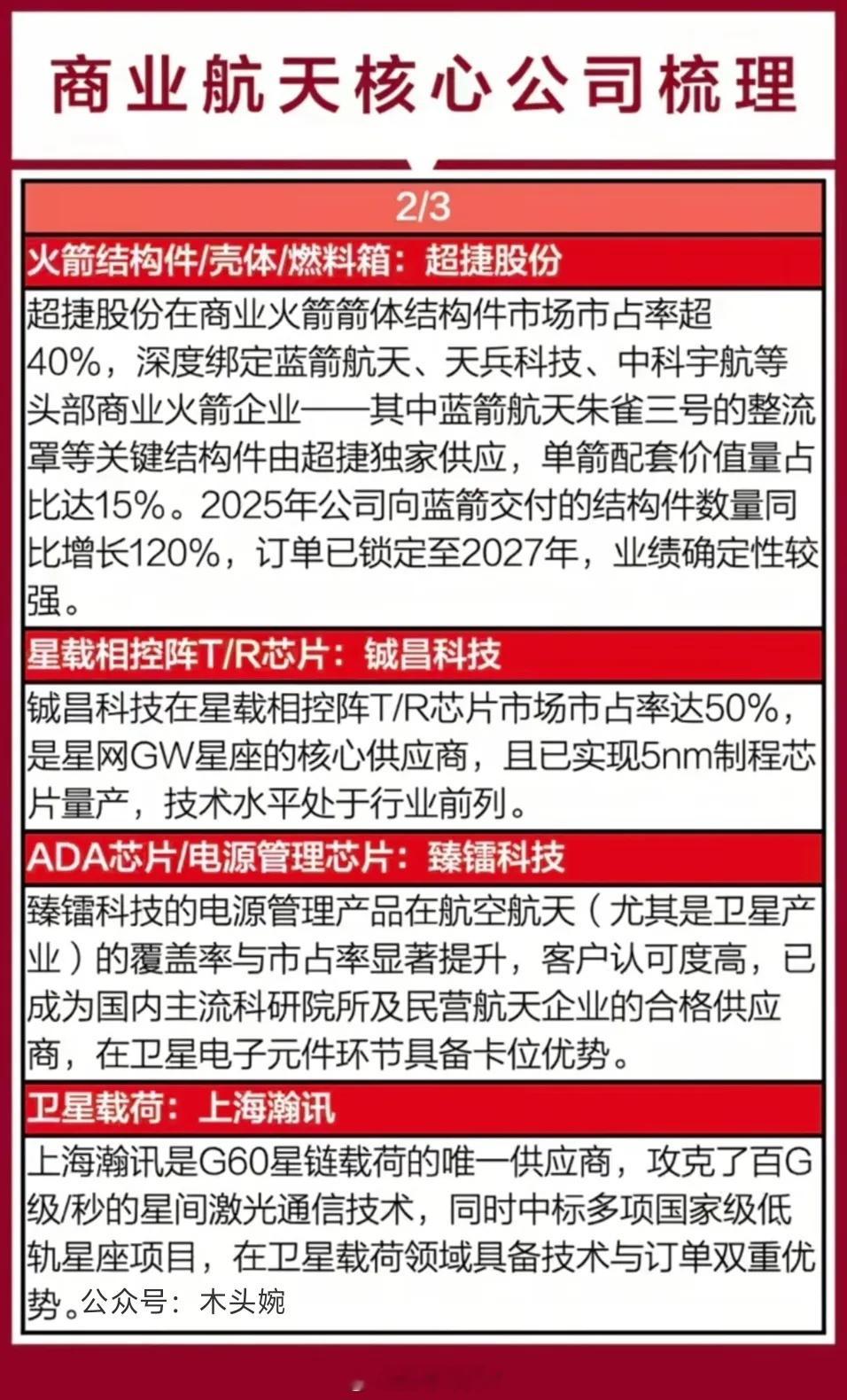 商业航天重磅利好,最新版本题材概念龙头梳理出炉!全球及中国商业航天市场规模均呈高速增长态势,国内因政策与技术双重加持,增速尤为突出。到2030年国内市场规模预乐观预估则可达7 - 10万亿元,这一增长将受益于卫星互联网组网、可回收火箭技术落地及手机直连卫星等应用场景的普及。商业航天产业链从火箭发动机材料到卫星载荷,哪些核心企业凭技术和市占率站稳脚跟,这十大行业龙头未来值得关注!航天材料龙头代表有西部材料、国机精工。火箭发射行业龙头代表有航天动力、超捷股份等等。卫星运营方面的核心龙头代表有中国卫星、天银机电等等。资料取材网络仅供参考不能作为投资依据,理财有风险入市需谨慎!航天概念股航空航天板块