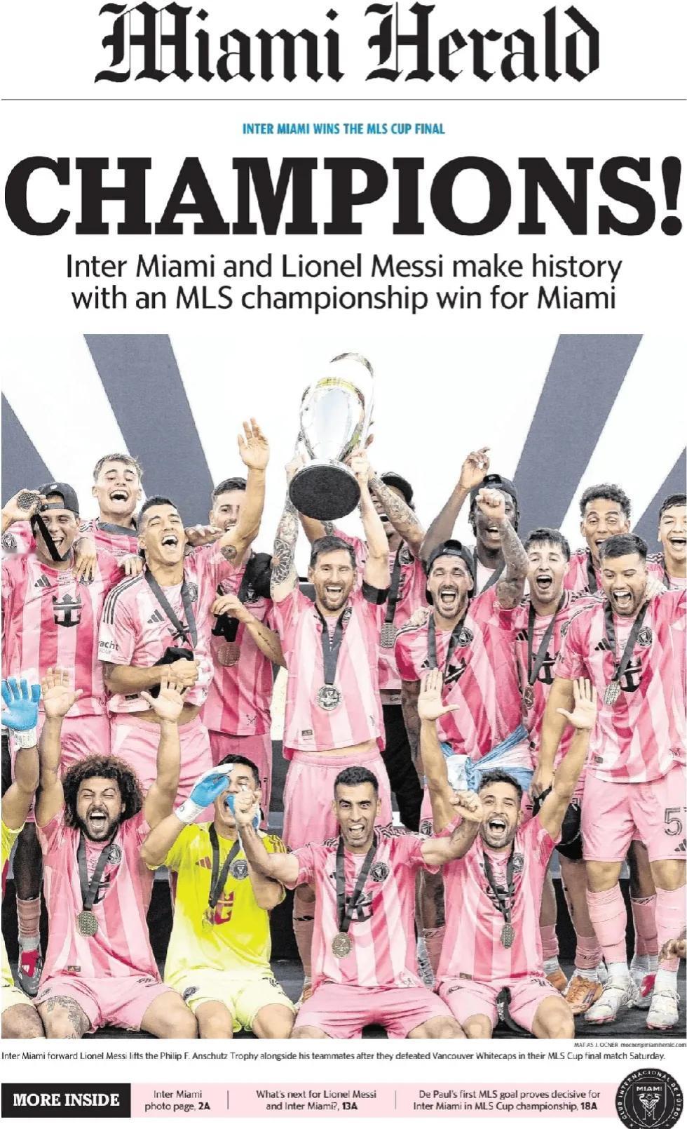《迈阿密先驱报》头版报道称,迈阿密国际和莱昂内尔·梅西凭借迈阿密在美国职业足球大联盟(MLS)夺冠创造了历史冠军! 周六,迈阿密国际队前锋莱昂内尔·梅西在MLS杯决赛中击败温哥华白帽队后,与队友们一起举起了菲利普·F·安舒茨奖杯。