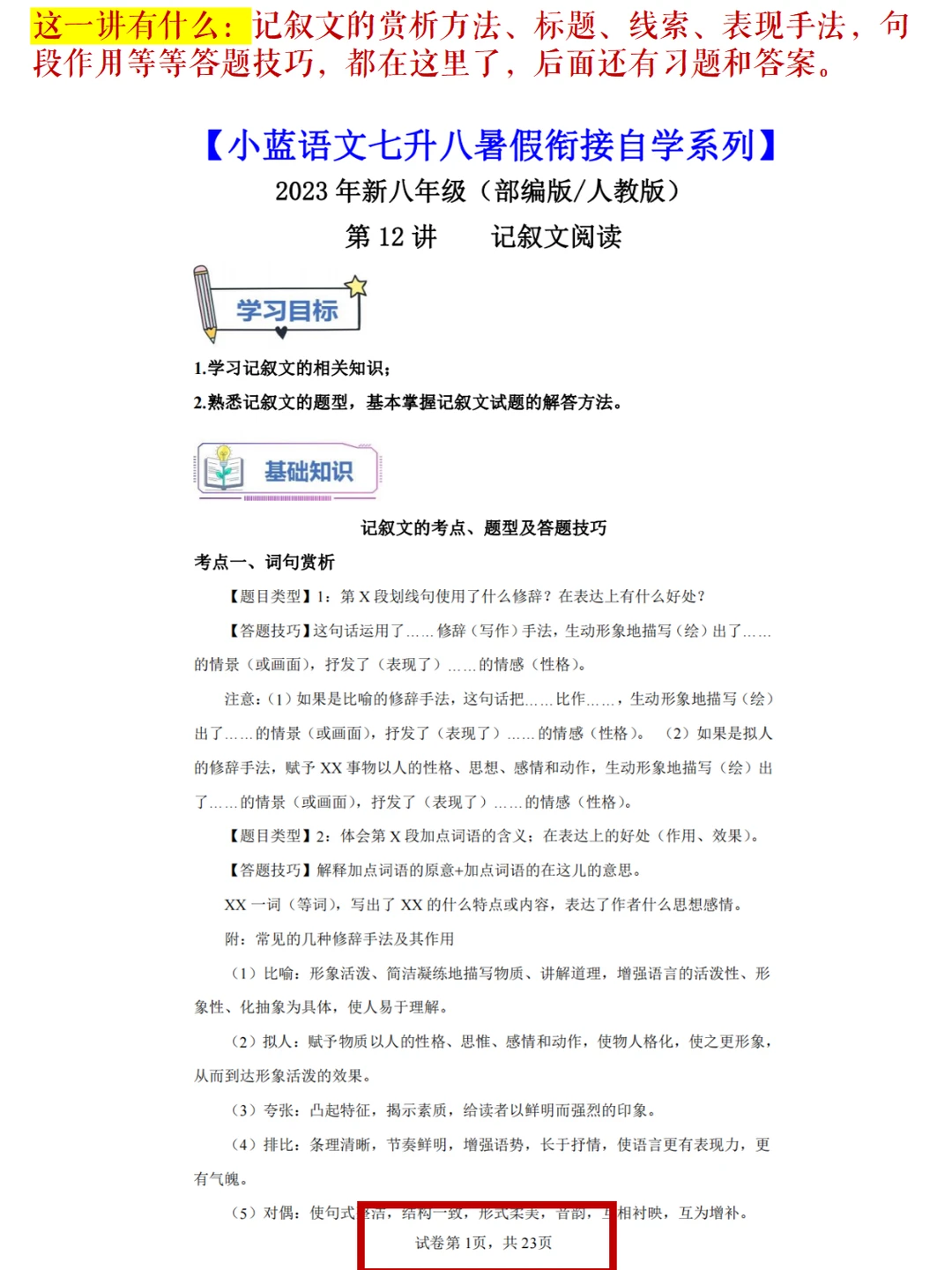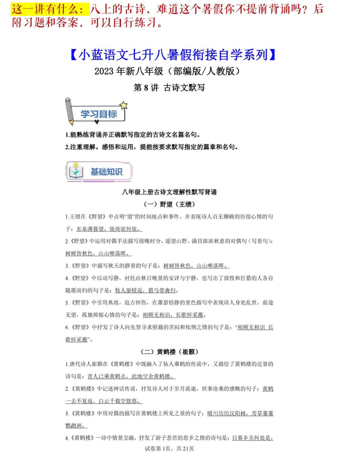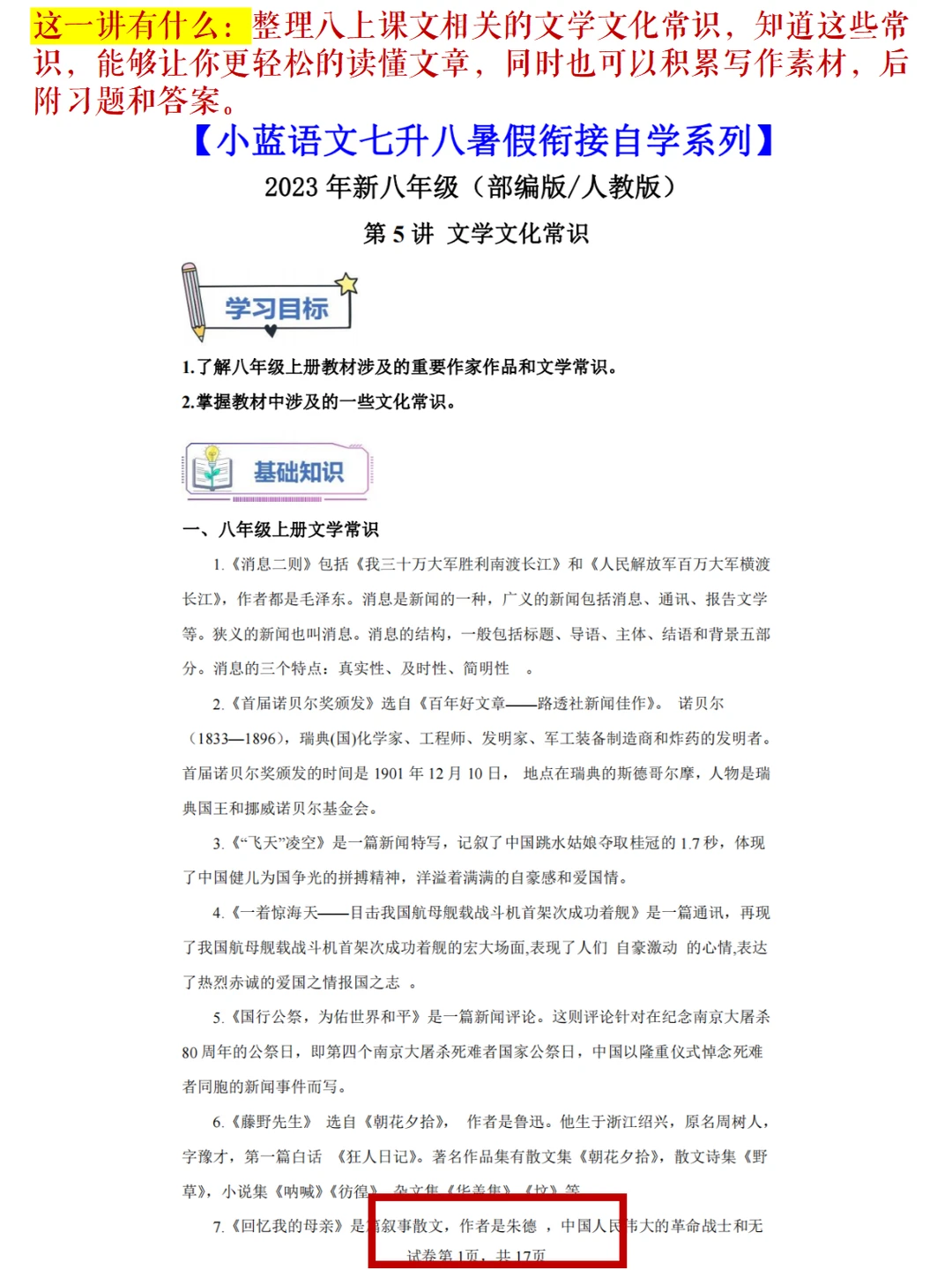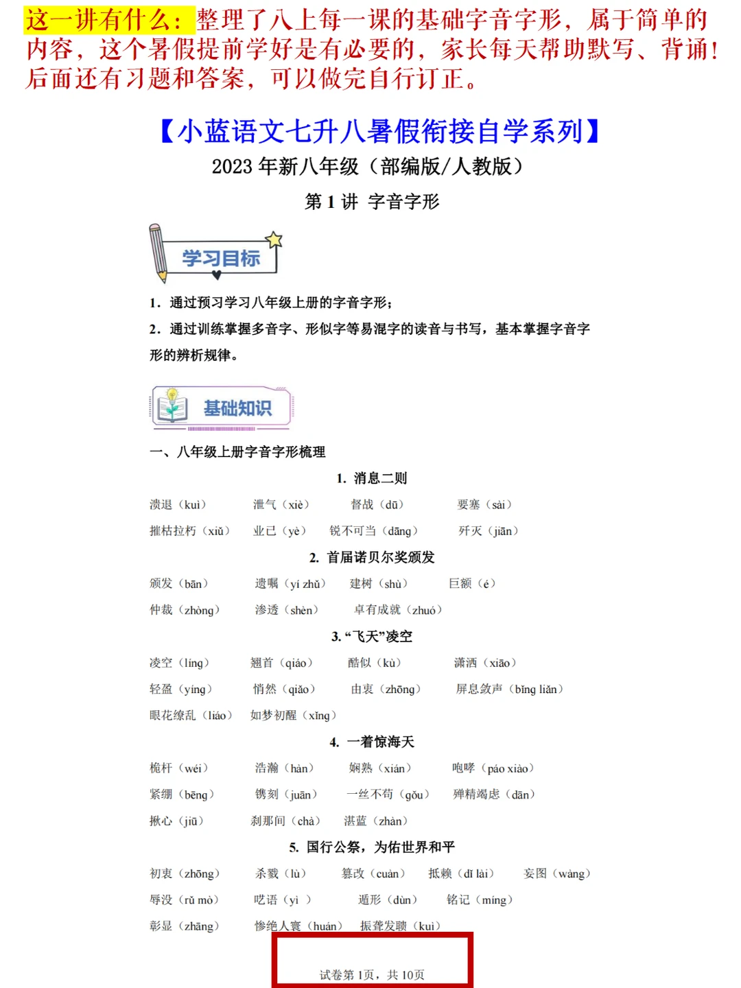✔️今天,满足你们需求的资料终于来了,这个暑假就认准这一份,每天花1小时时间,先预习八上语文课本里的课文,然后拿出这份资料,找到对应章节,对基础知识进行背诵,完成对应的习题,然后对答案,订正,做好笔记。