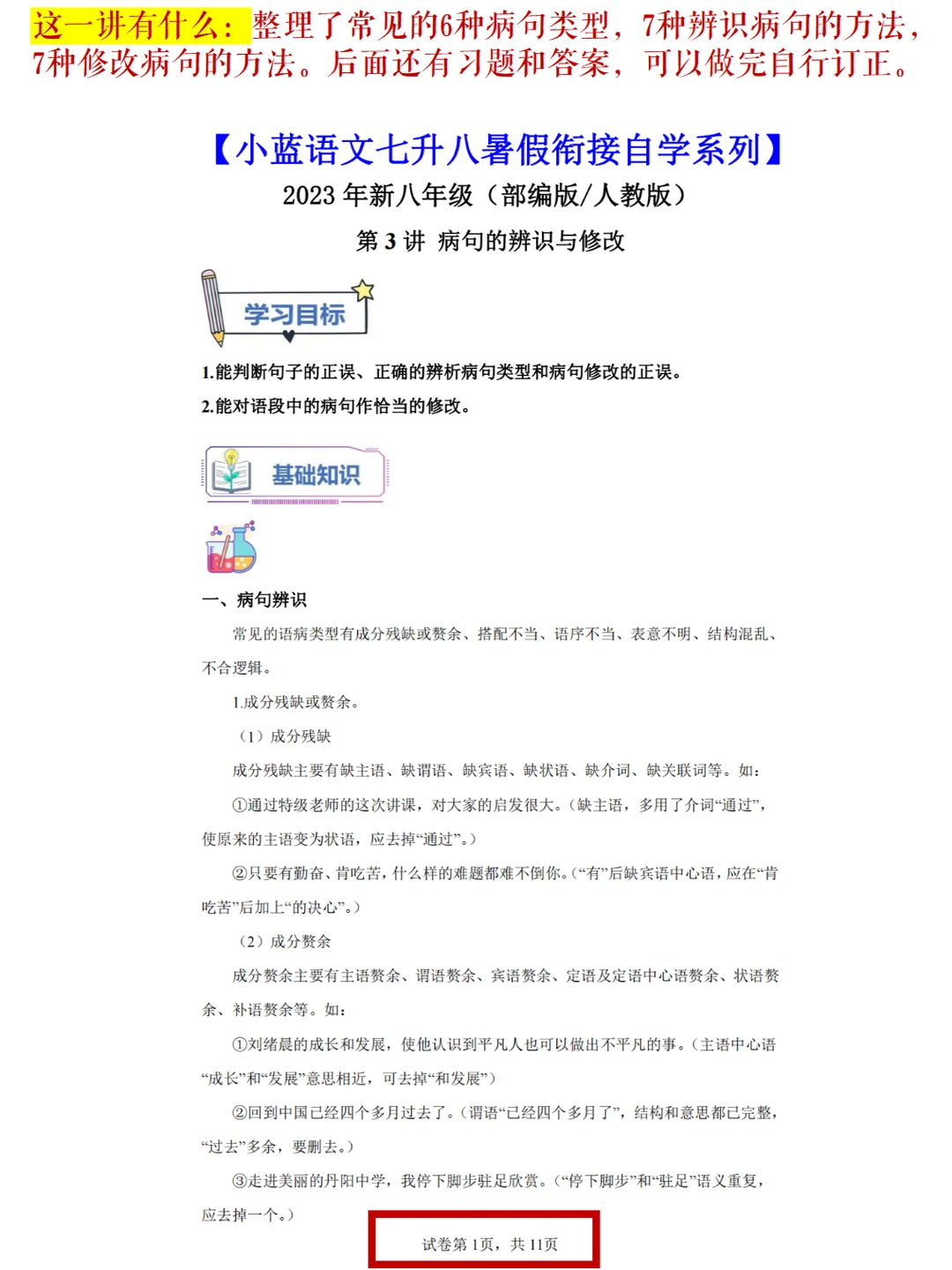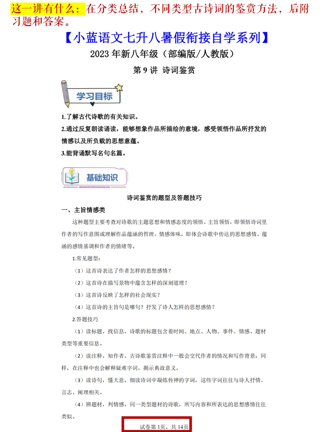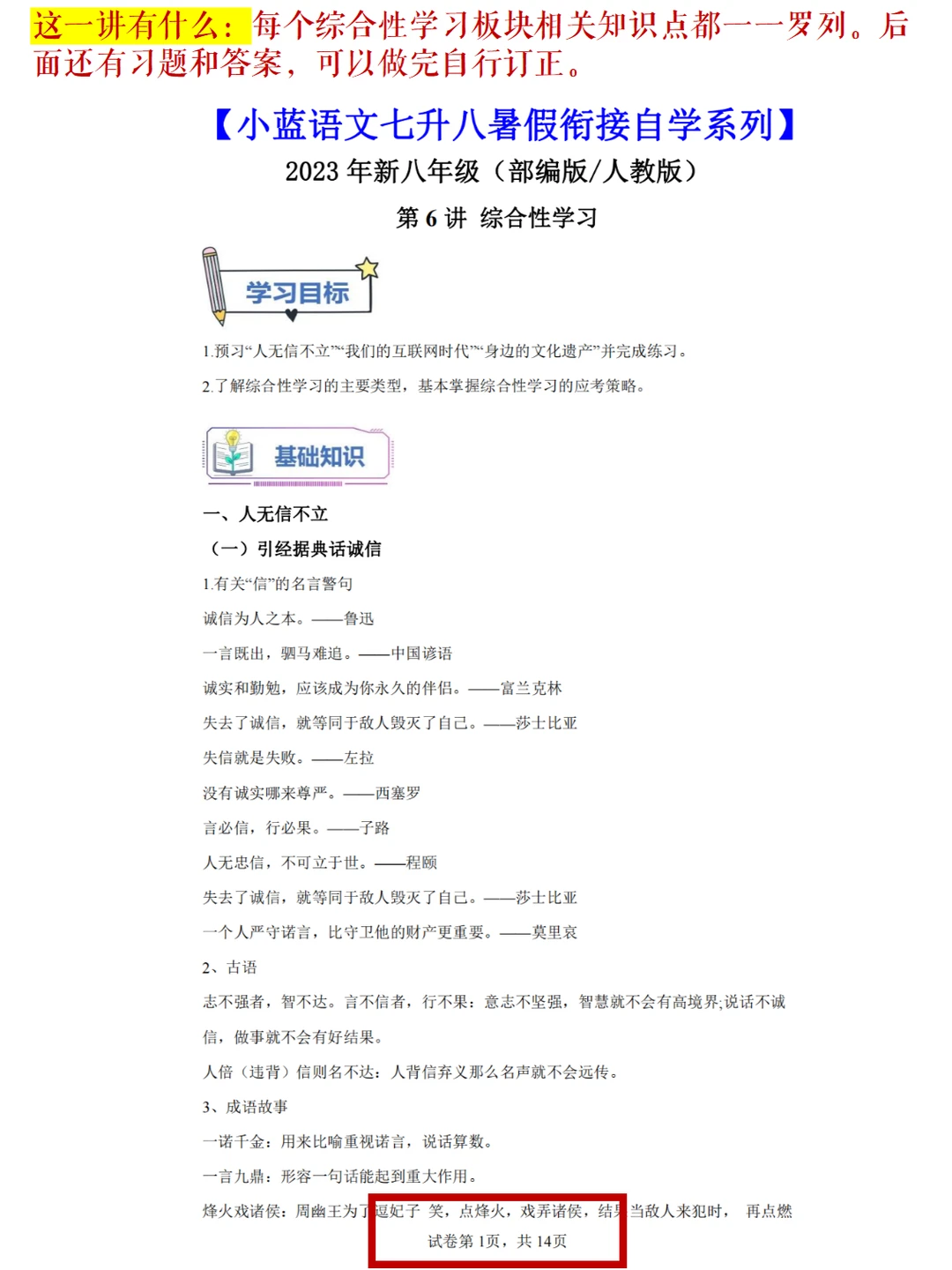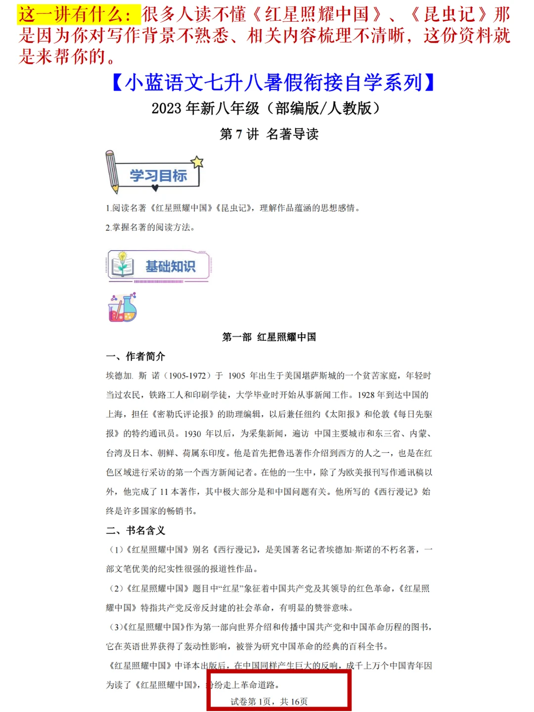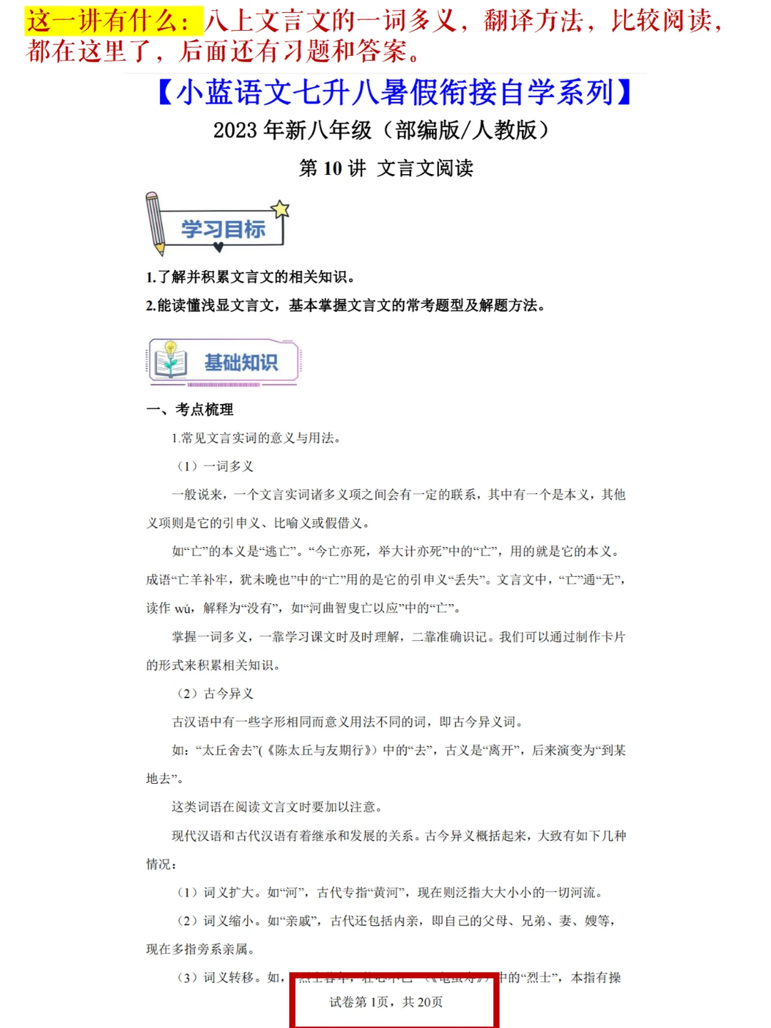 ✔️今天,满足你们需求的资料终于来了,这个暑假就认准这一份,每天花1小时时间,先预习八上语文课本里的课文,然后拿出这份资料,找到对应章节,对基础知识进行背诵,完成对应的习题,然后对答案,订正,做好笔记。