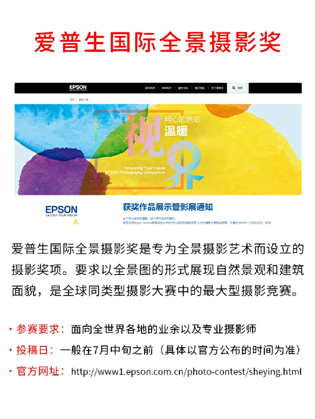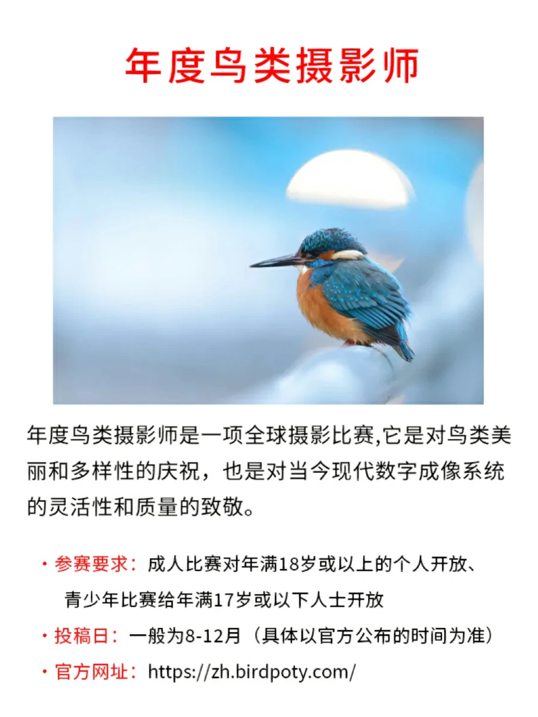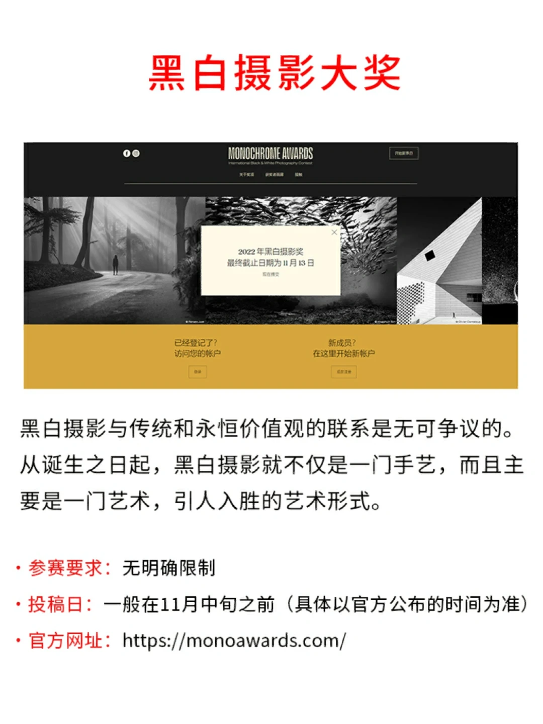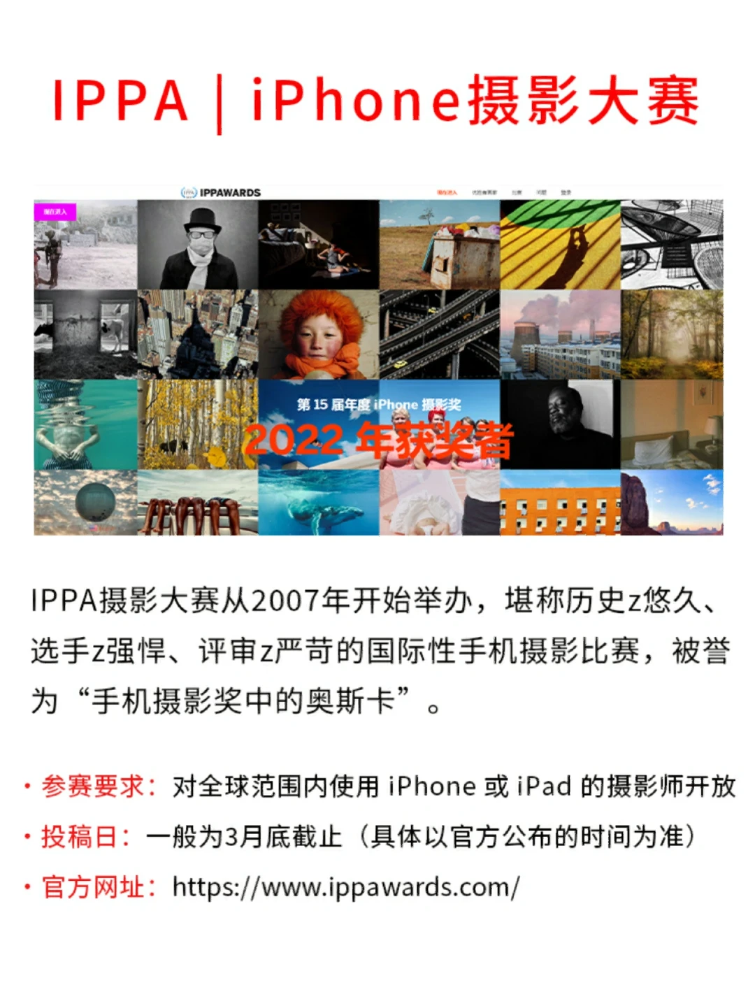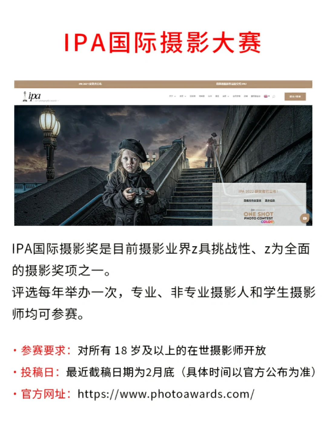 想通过摄影实现自我提升并获得收入💰❓ 👀今天推荐的⑨个摄影比赛含金量同样非常可观✌️,并且也有国内自主举办的国际大赛,都是对参赛摄影师年龄等要求比较宽松的呢~ 高校学生也可以猛猛冲哦[赞R][赞R] PS:这9个比赛需要一定的参赛费用,在几十到几百不等~ [害羞R]参赛要求、投稿时间✅和报名地址✅我都在笔记里写清楚啦!其他参赛的具体要求可以去大赛的官方渠道了解哦![萌萌哒R][萌萌哒R]