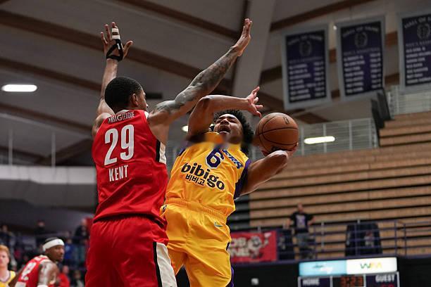 前老鹰首轮秀科比-巴夫金在NBA发展联盟代表湖人的下属球队南湾湖人对阵开拓者的下