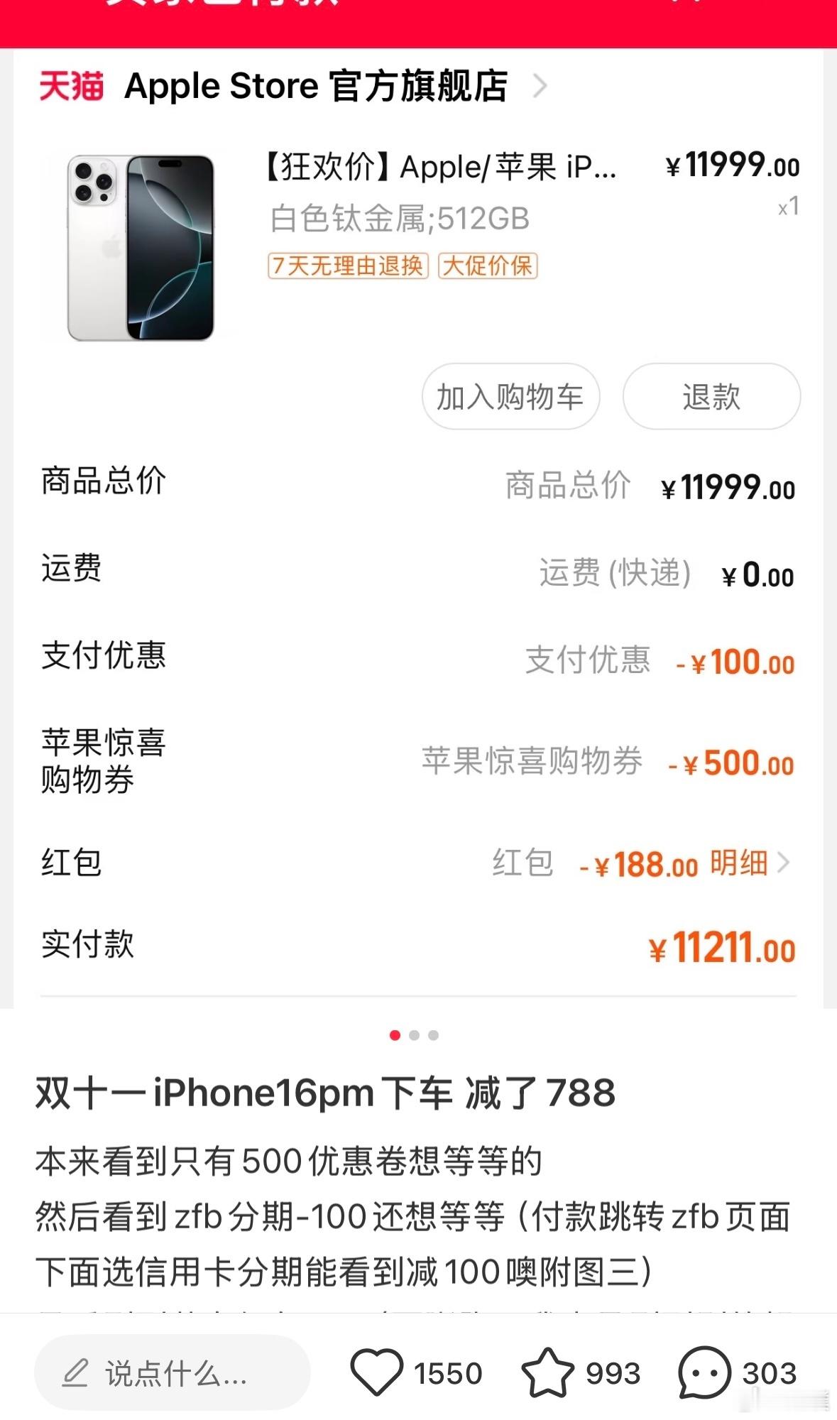 iPhone17Pro官方破价 去年双十一iphone 16的优惠卷是500,这么对比,今年的诚意少了点啊