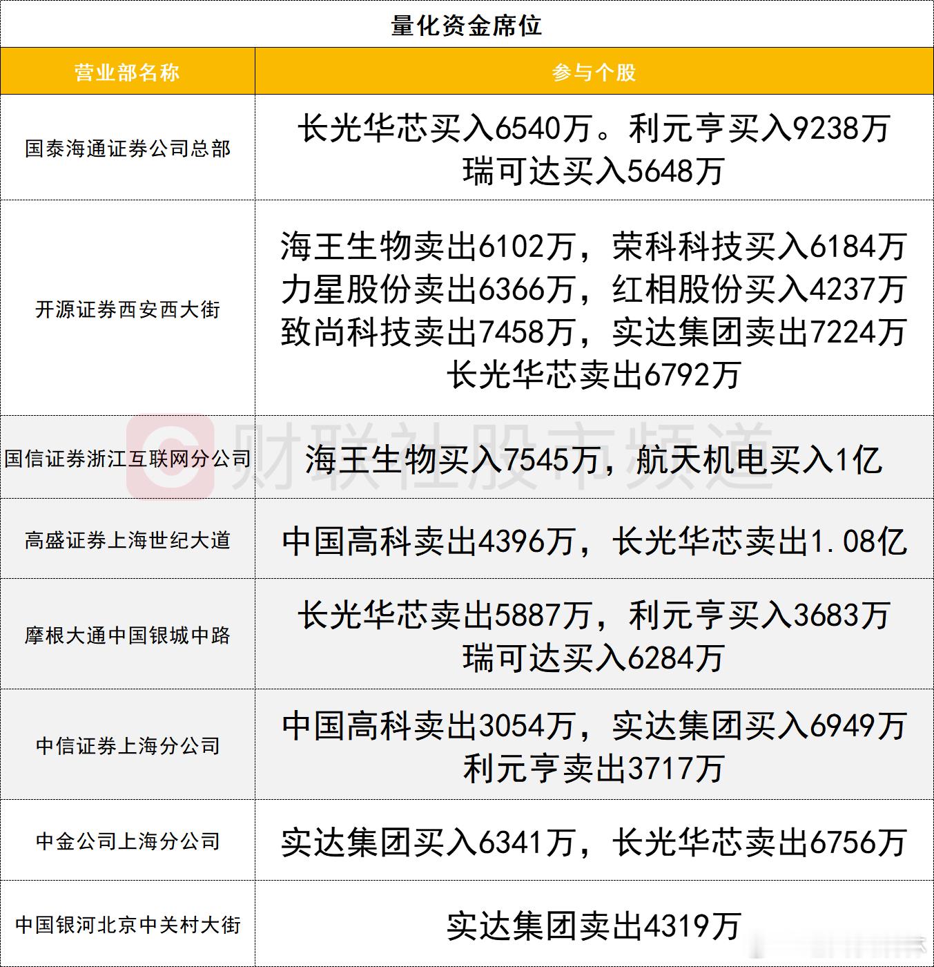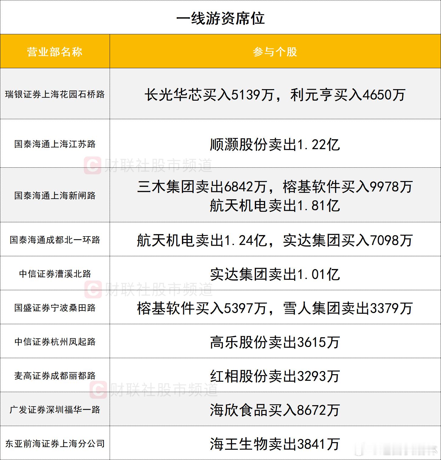 a股 龙虎榜1、机构今日龙虎榜机构活跃度明显提升,买入方面,榕基软件获两家机构买入5569万,同时遭一家机构卖出2818万。雪人集团获四家机构买入1.82亿。福建本地股叠加商业航天概念的红相股份获三家机构买入1.14亿。卖出方面,广东宏大遭四家机构卖出2.01亿。太阳电缆未能晋级5连板,遭三家机构卖出1.07亿。2、游资一线游资活跃度有所提升,榕基软件涨停,获两家实力游资席位(国泰海通证券上海新闸路、国盛证券宁波桑田路)合计买入1.53亿。另一只福建本地股海欣食品获一家一线游资席位(广发证券深圳福华一路)买入8672万。航天机电遭两家实力游资席位(国泰海通证券上海新闸路、国泰海通证券成都北一环路)分别卖出1.81亿、1.24亿。量化资金活跃度较高,长光华芯遭量化资金激烈博弈,其中一家量化席位(国泰海通公司总部)买入6540万,四家量化席位(开源证券西安西大街、高盛证券上海世纪大道、摩根大通中国银城中路、中金公司上海分公司)合计卖出3.02亿。