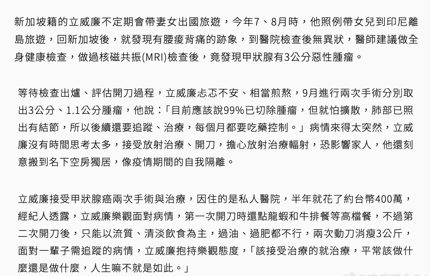立威廉患癌,已经做了两次手术,这么突然?立威廉患甲状腺癌