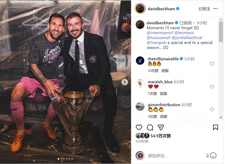 迈阿密国际老板贝克汉姆更新社媒动态,晒出与梅西的合照,两人身前则是美职联冠军奖杯,贝克汉姆配文:“永生难忘的时刻,为一个特别的赛季画上特别的句点。”