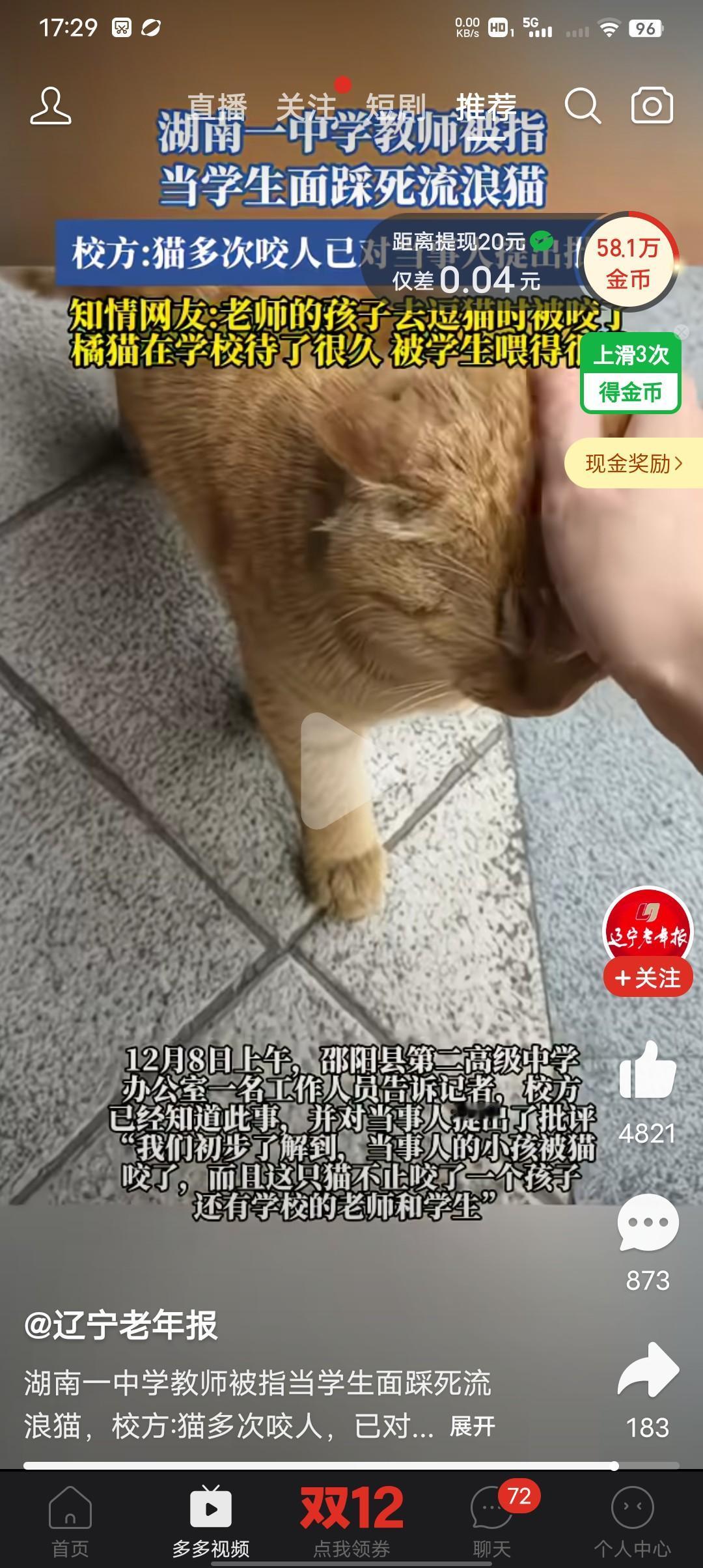 竟然有老师当着学生的面踩死流浪猫,你可以不爱,但不能伤害! 12月7号网友反映湖南邵阳县第二高级中学,一名老师当着学生的面踩死流浪猫。有知情网友称:因为老师的孩子在逗流浪猫的时候被猫咬伤了,这位教体育的老师,当着学生的面把猫踩死了。 有网友说猫是不会主动袭击人的,那猫是有多信任人类在啊!那老师靠近的时候那猫都没有跑,校园里还有一只橘猫,在校园里已经待了很久,被学生投喂养的特别的胖。 12月8日上午,邵阳县第二高级中学办公室一名工作人员告诉记者,校方已经知道此事,并对当事人提出了批评“我们了解到当时的小孩被猫咬了这只猫不止咬了一个孩子,还有学校的老师和学生,” 看到好多评论说学校就是在包庇这位老师,好多人都说猫是不会主动伤人的,肯定是孩子先惹急了猫。这样的老师能教育出好的学生吗?自身的品德都有问题,怎么能以身作则的教育学生呢?这样的学校这样的老师学生的前途堪忧啊!