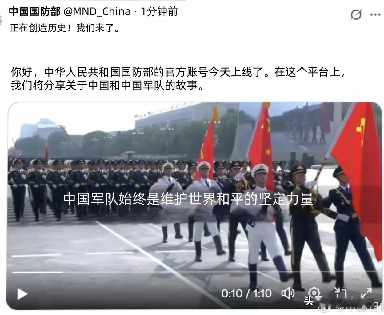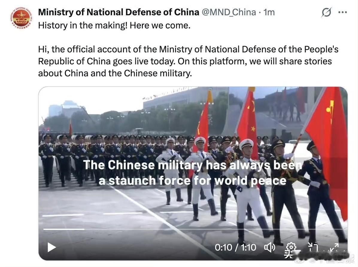 我们的国防B,在X平台注册账号了,同步发文了! 就在辽宁舰航母编队北上之时,我们的国防部,正式在X平台上,注册了官方账号,并且发布了第一条英文贴文动态:“见证历史,我们来了!” 首条贴文下,还配发了一条长约1分钟的视频,展示了中国军队演习训练、执行海外任务、参与国内应急救灾的画面。视频的英文序言说:“和平是人类的共同愿望和崇高目标。中国军队始终是维护世界和平的坚定力量。” 这就是,大国力量!我们要自己发声了,让全世界不明白我们的,更好的了解我们的历史以及如今的实力,我们绝不会允许日本开历史倒车,更不会允许日本军国主义复活! 从此,世界将听到来自东方大国的铿锵有力的声音! 大家怎么看?评论区说说你的看法吧!军事号