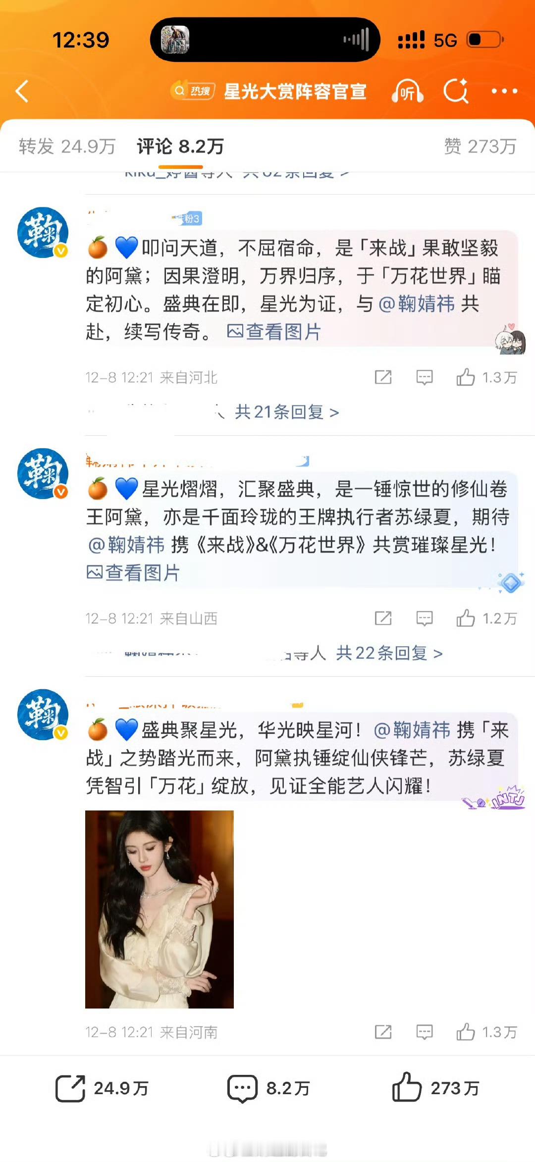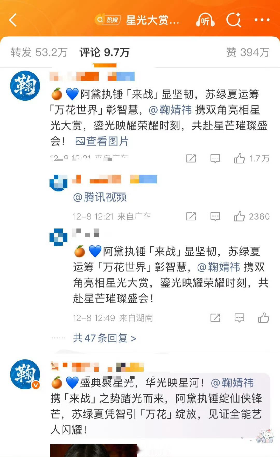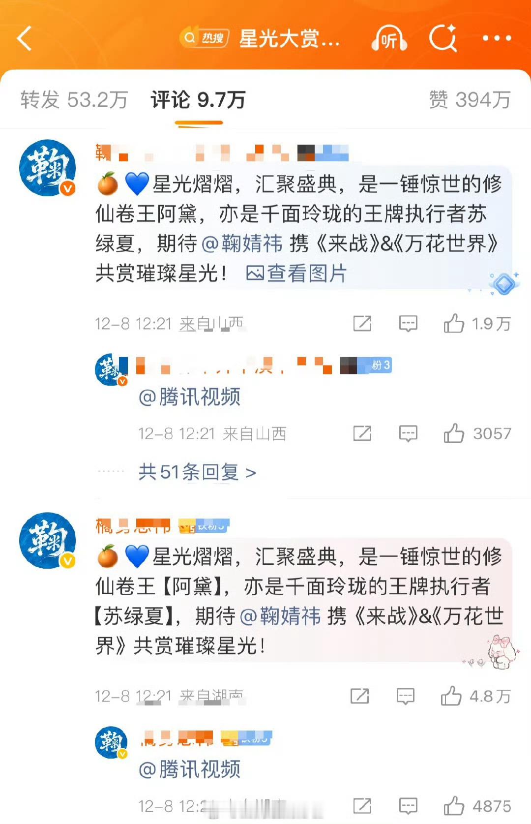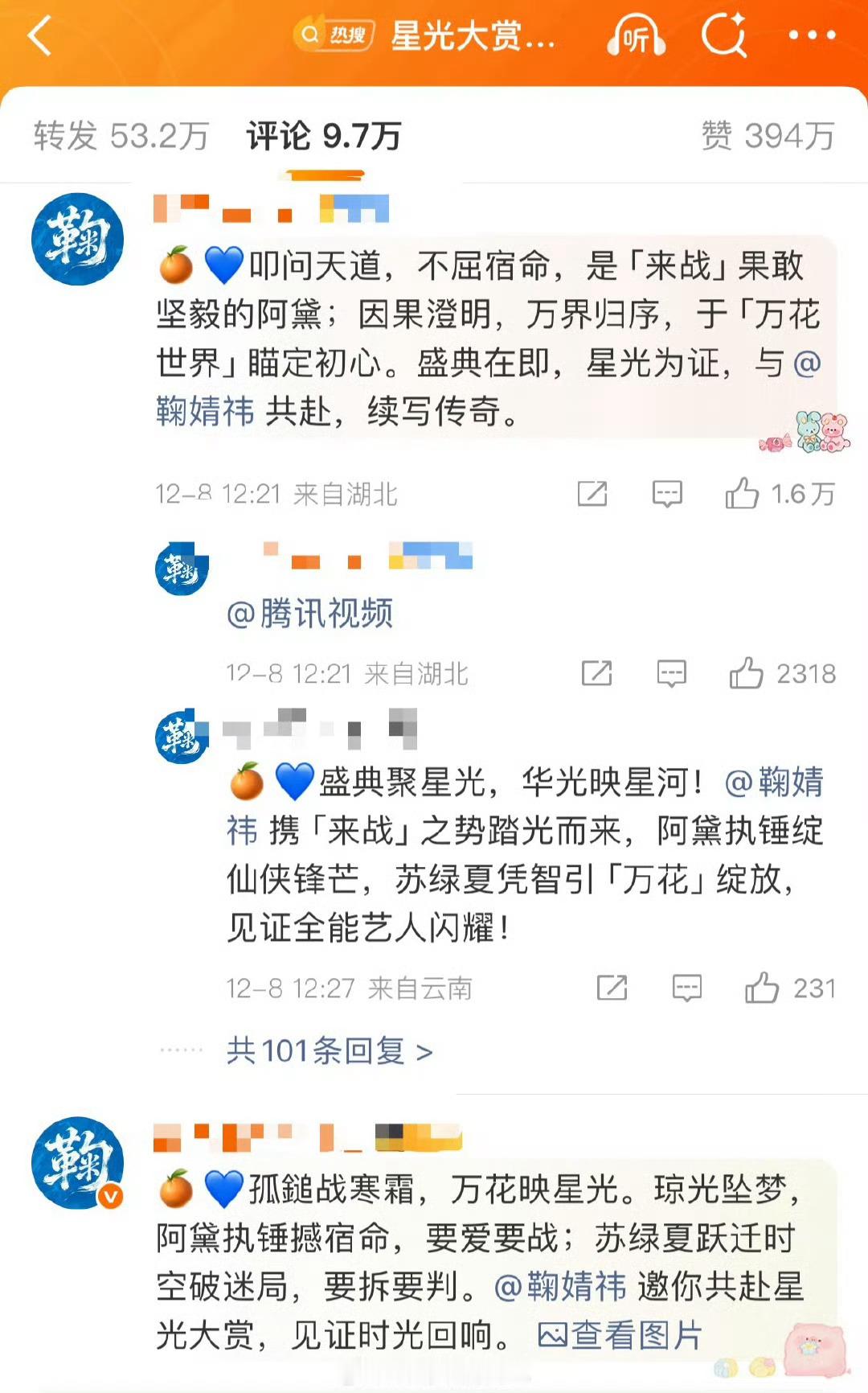 星光大赏阵容官宣!官博评论区前十全是鞠婧祎粉丝,太厉害了。 你们觉得和尖叫之夜比哪一个更有看头?星光大赏阵容官宣 星光大赏官宣热度