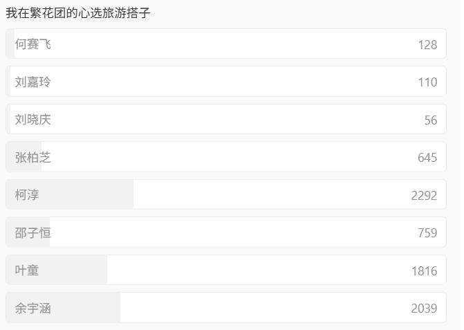 万万没想到,刘晓庆在一路繁花的嘉宾中排名倒数第一,成为网络票选当中大家最不想要的旅游搭子,票数连柯淳和邵子恒的零头都不到。这是明晃晃的欺负刘晓庆的粉丝年龄大,很多都不上网吧? 旅行的意义一半是美丽的风景,而另外一半就是身边一起旅行的人。 所以一路繁花节目组在网上发起来限时投票活动。让大家在繁花团包括何赛飞、刘嘉玲、刘晓庆、张柏芝、柯淳、邵子恒、叶童以及余宇涵在内的所有的嘉宾当中,选出最想要的旅游搭子。 得票最高的前三名就是,柯淳2292,余宇涵2039,以及叶童1816,而票数垫底的就是队内年龄最大的刘晓庆了,她仅仅得到了56票,连一百票都没有。 一共有7648位网友参与了投票活动,大多数的票数都集中了年轻的弟弟身上,反倒是除了叶童之外的姐姐们票数都不多,刘晓庆最少。 联想到节目中,经常有笑起来牙都没有了的老人,轻松就说出刘晓庆的名字和她的电影,刘晓庆已经75岁了,相应的她的粉丝年龄也都不小了,他们基本上不会知道这些投票活动,自然也不会为自己的偶像投票,所以刘晓庆的票数最少也就可以理解了。 节目组搞出这样的投票活动意义何在呢?